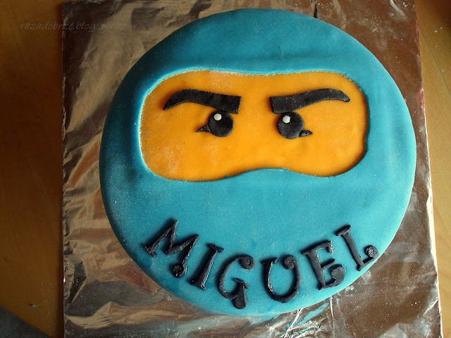 Był to tort błyskawiczny; dowiedziałam się, że mam go przygotować dzień przed planową imprezą. Użyłam więc sprawdzonego przepisu na wilgotny i miękki kakaowy biszkopt, który przełożyłam pysznie czekoladowym kremem. Jeśli chodzi o dzieci, to jest to połączenie zawsze trafione. Dekoracja to twarz jednego z wojowników z tak ostatnio popularnego Lego Ninjago. Niebieski, zdaje się, ma moce związane z wodą... Ale paznokcia sobie uciąć nie dam.