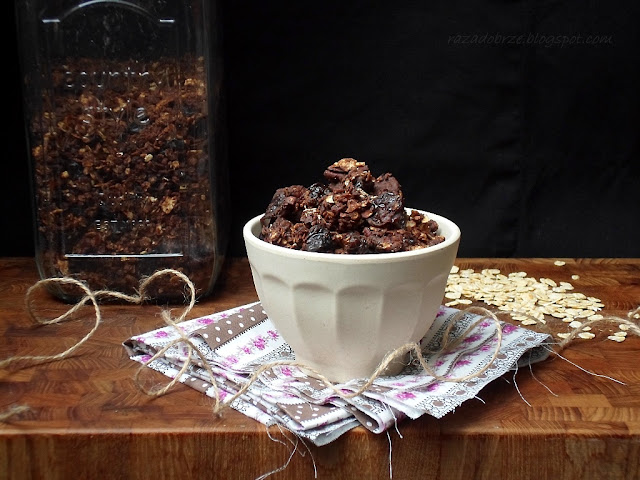 Ta akurat jest obłędnie czekoladowa. Kakao, ciemna czekolada i malutkie, chrupiące kawałeczki ziaren kakaowca. Osłodzona (według C. za mało) syropem klonowym i lekko dymnym cukrem muscovado. Do tego słodko-kwaśne kawałki suszonych wiśni, i już nic więcej nie potrzeba do szczęścia. Intensywnie czekoladowa, niemal wytrawna w smaku (dla dzieci proponuję pominąć ziarna kakaowca, i przynajmniej część czekolady zamienić na mleczną), dla mnie idealna. Rozpoczęty nią dzień, nawet taki w środku nocy, po prostu musi być dobry.