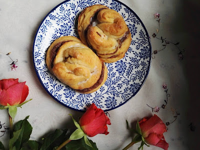 Tak, wiem, ta nazwa wydaje się dość dziwna. Czym są bowiem pluszki? Co to takiego i z czym to się je? Śpieszę więc wyjaśnić, że pluszki to po prostu drożdżówki. Dokładnie rosyjskie, specyficznie zawijane, w bardzo ciekawy kształt. Ale o ich niezwykłości świadczy nie tylko kształt, ale i sposób produkcji. Nie dodaje się bowiem do ciasta jajek, zamiast tego dokładamy... majonez. Tak, ja też z początku byłam przerażona, czy to się uda? Czy ktoś to w ogóle zje? Obawy okazały się płonne, pluszki w moim domu zniknęły w dwa kwadranse, a ja w ciągu miesiąca przygotowałam je już 3 razy. Są idealne. Bardzo lekkie, delikatne, mięciutkie. Po upieczeniu oczywiście w ogóle nie czuć dodatku majonezu, zaś czuć niezwykłą delikatność. Wyrabianie ciasta na pluszki to czysta przyjemność, nie jest to wcale skomplikowane. Sam sposób składania tak samo, nie jest specjalnie trudny. Zaręczam, że wyjdzie Wam już pierwszy. Przejdźmy do nadzienia. Nadziewać można wszystkim. Makiem, twarogiem, konfiturą, orzechami czy czekoladowymi kremami. Świetnie będzie też pasować tradycyjne nadzienie z cynamonowym masłem, albo przesmażone jabłka. Ja wybrałam nadzienie z pasty sezamowej, do której dodałam gorzką czekoladę. Akurat miałam otwarty słoik sezamowej pyszności i postanowiłam wykorzystać ją do przygotowania nadzienia. To był strzał w dziesiątkę. Takie nadzienie jest oryginalne i przepyszne. Niezbyt słodkie, ciekawe, czekoladowe...