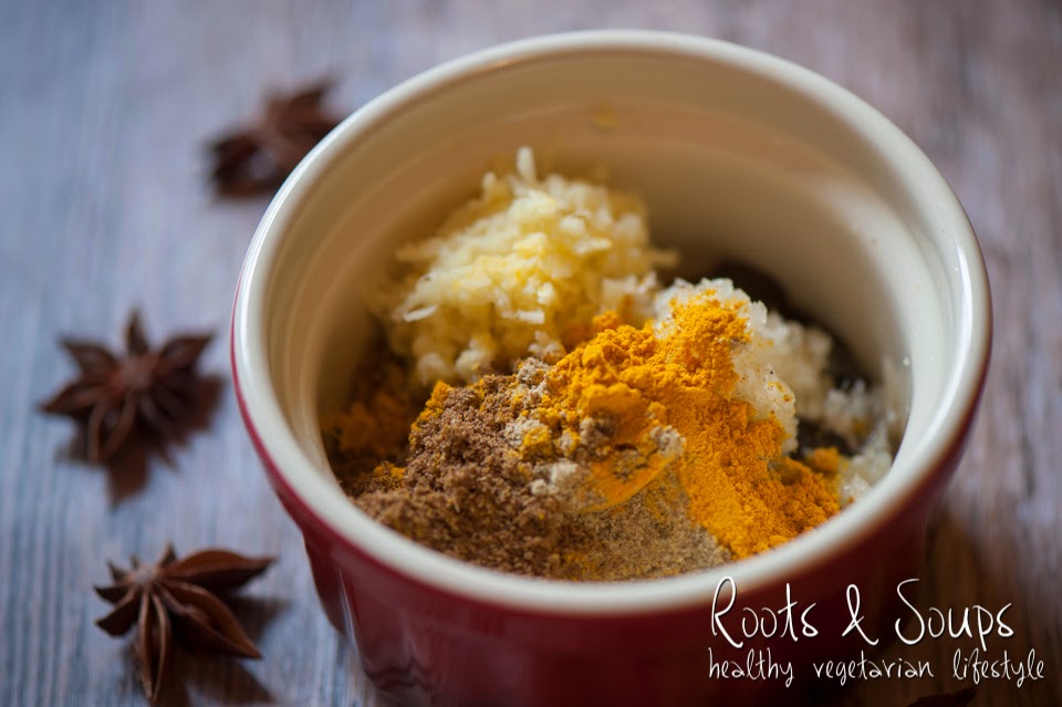 Skłądniki wymieszać w misce. Gotową masę użyć do marynowania dowolnych składników jak warzywa, tofu, tempeh itd lub dodać do dań typu curry lub jednogarnkowych.