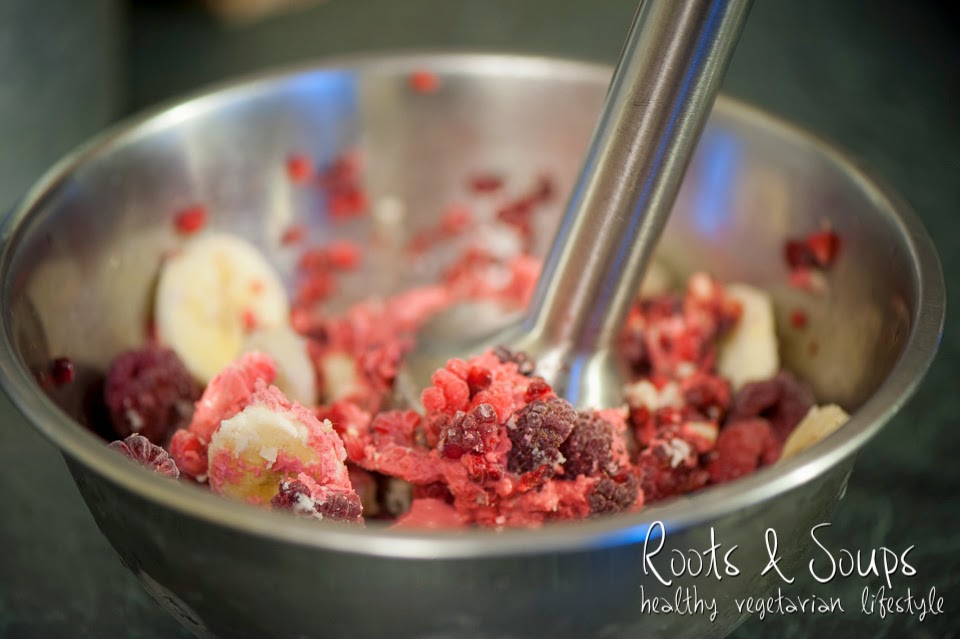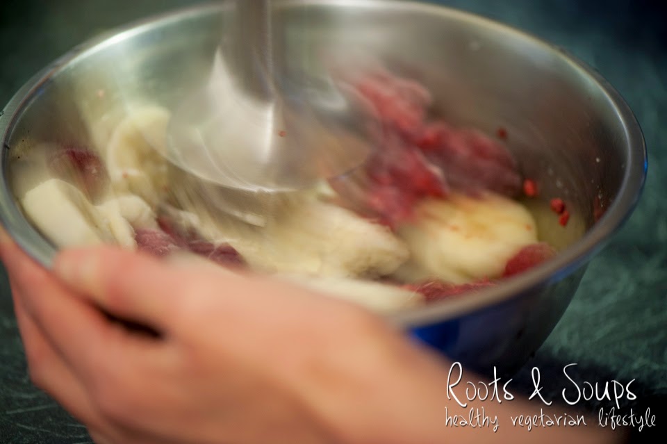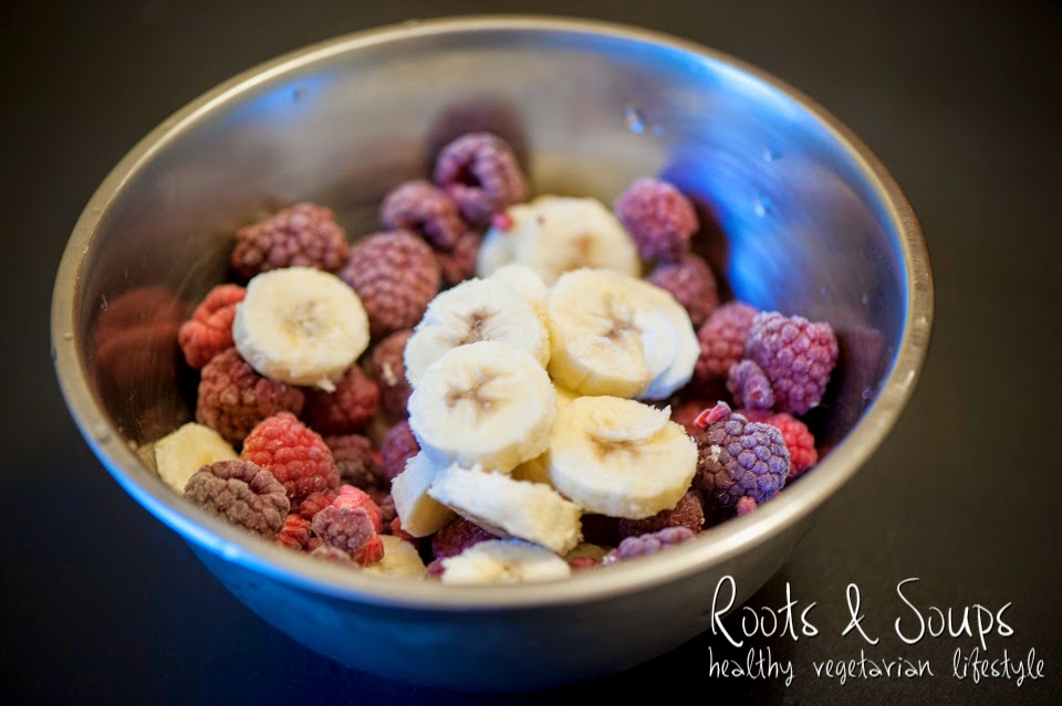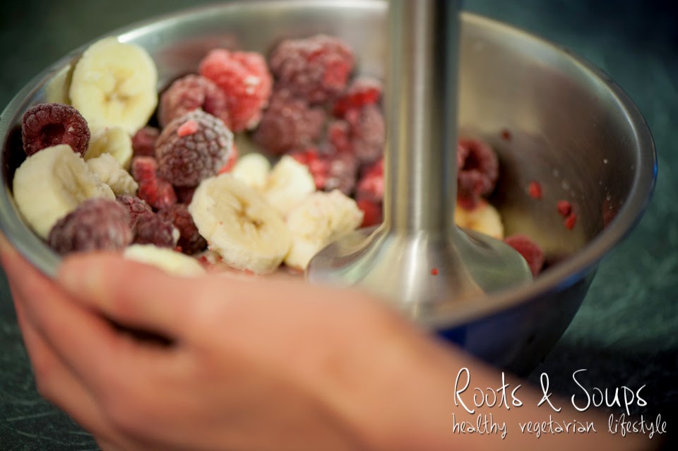 Banany pokroić na grube plastry, wstawić do zamrażarki na godzinę. Kiedy będą zmrożone zblendować razem z mrożonymi malinami i masłem orzechowym. Można też użyć malaksera.