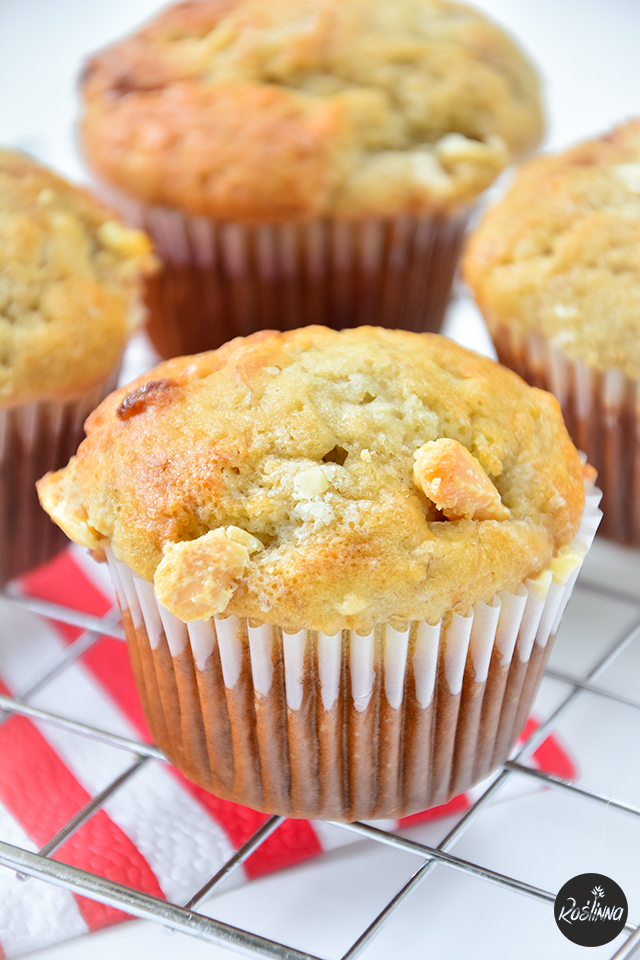 Zawsze znajdę pretekst do przyrządzenia deserów z dojrzałymi bananami. I nie trzeba go szukać zbyt daleko, patrząc na piętrzącą się w rogu kuchni sporą pokrytą czarnymi znamionami bananową kiść – jednym słowem sposób zawsze się znajdzie. A jako że przygotowanie babeczek jest równie przyjemne, więc bonus jest podwójny - zazwyczaj suche składniki miesza się z mokrymi, co nawet nie wprawionej osobie zajmuje najwyżej 10 minut. Te babeczki w swoim składzie nie zawierają roślinnego mleka, tak więc spokojnie wytrzymają nawet te kilka dni – kto nie chciałby w tygodniu zabrać ze sobą takich babeczek do pracy czy szkoły? Poza tym można próbować je reanimować w piekarniku – 10 minut w 150 °C powinno wystarczyć. Jeżeli z jakiś względów nie chcesz używać jogurtu sojowego, śmiało możesz go zastąpić 2 łyżkami zmielonego siemienia lnianego z 6 łyżkami wody – najlepiej tego złocistego, który nie zmieni jasnej barwy ciasta.
