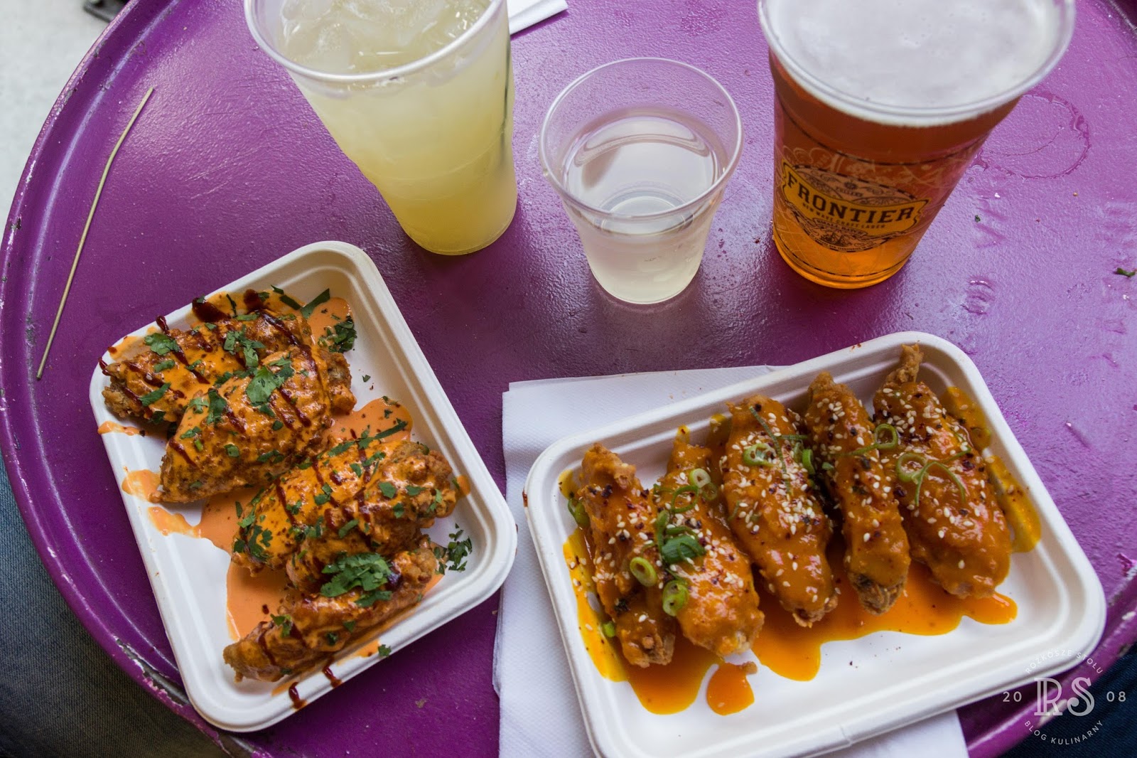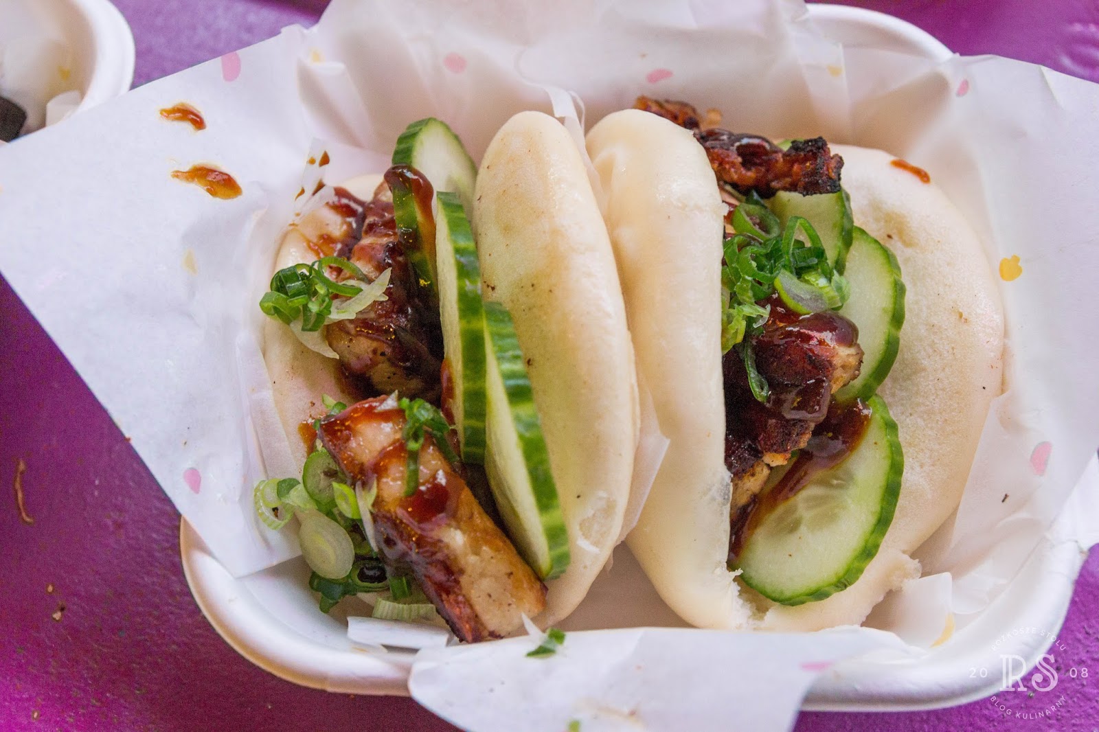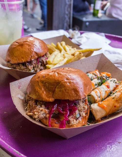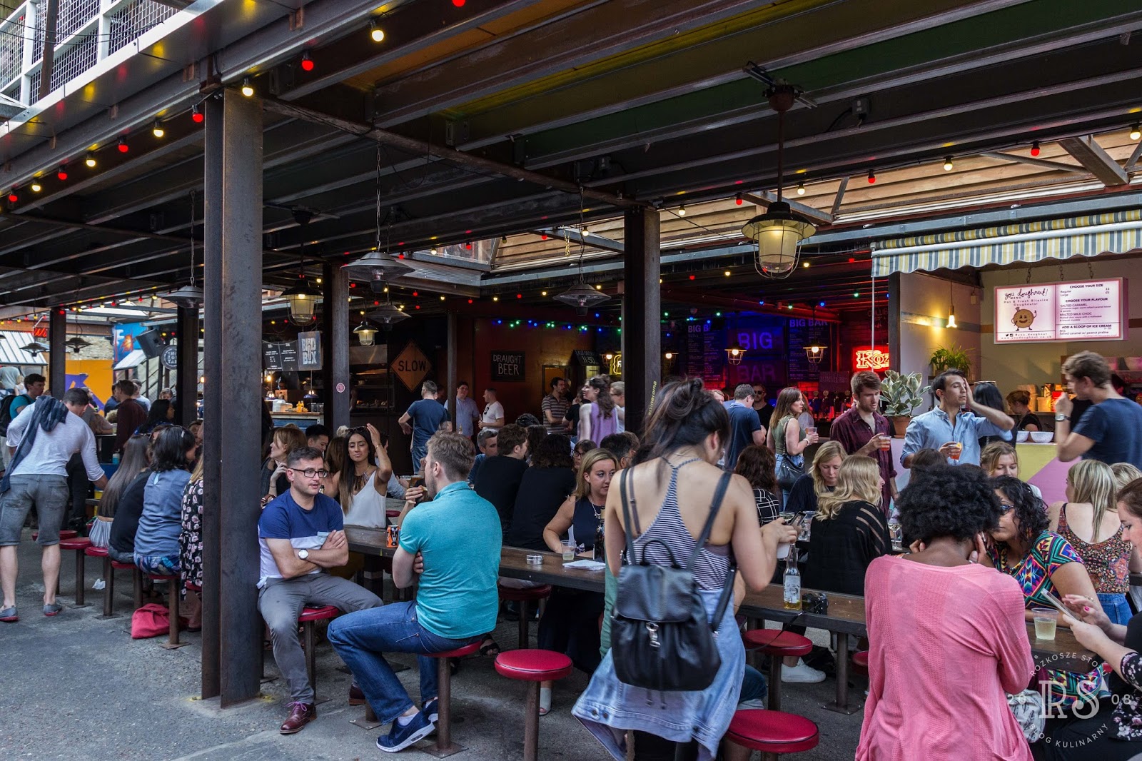 Noon to Late). Pośrodku wspólna ława, a po obu jej stronach stoiska z kulinarnymi rozkoszami. Porcje raczej niewielkie, więc można śmiało kosztować kilka rzeczy. Wszystko było obłędnie pyszne (buły z pulled duck śnią mi się po nocach, ale ostre żeberka na dwa sposoby i bao z chrupiącą wieprzowiną też były znakomite). Uwaga: po 19.00 za wstęp trzeba zapłacić 3 funty.
