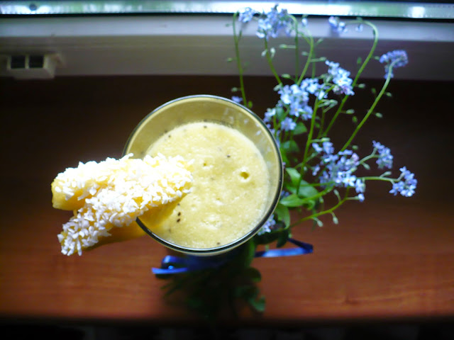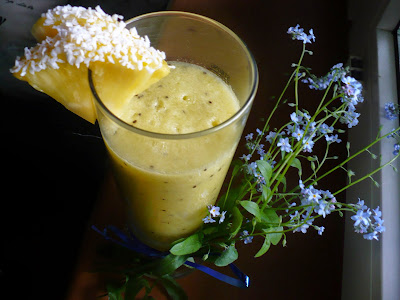 Nie wiem jak u Was, ale tu dzisiejszy dzień był brzydki i szary do bólu. Marcowo-listopadowy czwartek w maju, ot co. Aż człowiekowi się odechciewa wszystkiego... No, za wyjątkiem pysznego jedzenia, bo na to zawsze jest ochota. Z tego właśnie powodu zmusiłam się do obrania ananasa i oczywiście nie mogłam się powstrzymać przed wykorzystaniem go. W lodówce znalazłam wodę kokosową, którą można śmiało nazwać produktem prawie idealnym. Świetnie nawadnia, uzupełnia braki mikroelementów i jest źródłem wielu cennych minerałów jak chociażby potas, fosfor czy magnez. Dla mnie jedynym problemem jest jej smak. Po pierwszym łyku zaczęłam się zastanawiać, czy nie jest ona przypadkiem przeterminowana, ale wszystko było w porządku. Tak więc zaczęłam główkować, co mam począć z 0,5l tejże wody? Pomyszkowałam w internecie i natrafiłam na wiele koktajli czy smoothies z jej wykorzystaniem... A gdy już miałam gotowy napój, uświadomiłam sobie, że nie mam słomek. Mówi się trudno i pije się, jak leci!