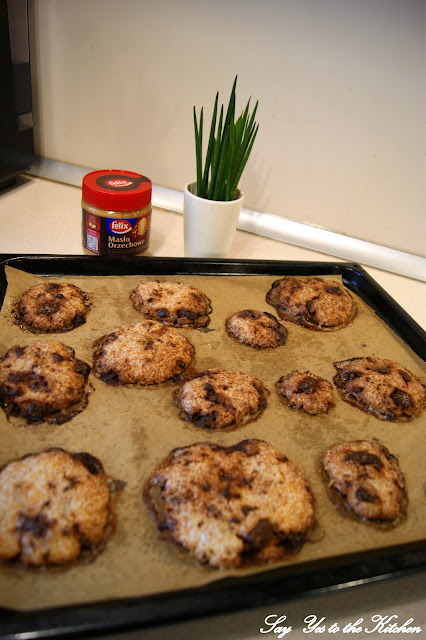 Formować z ciasta kuleczki wielkości orzecha włoskiego. Delikatnie rozpłaszczając układać na blaszce, w odstępach od siebie. Piec przez 10- 15 minut do zezłocenia. Najlepiej smakują z mlekiem.