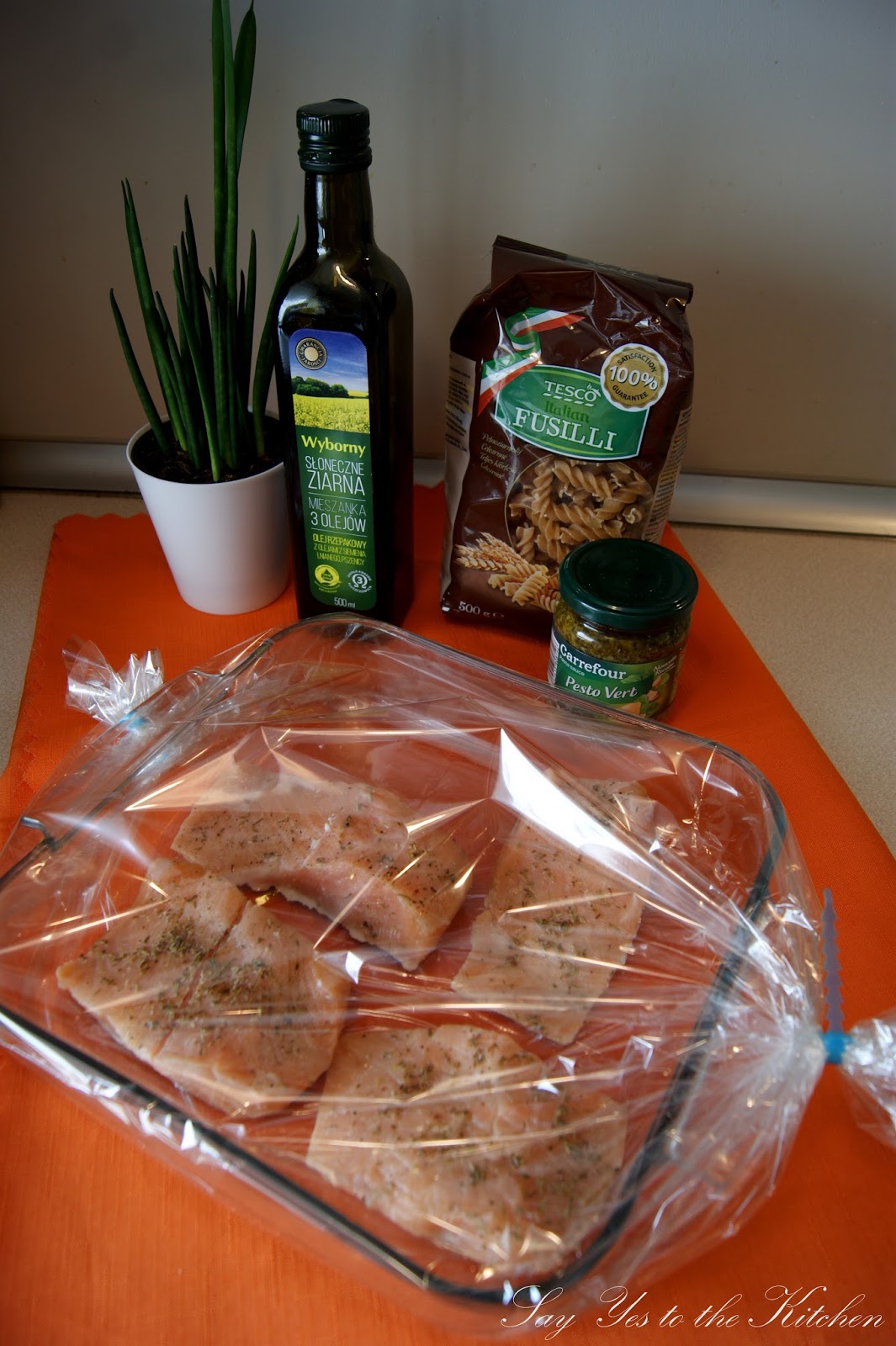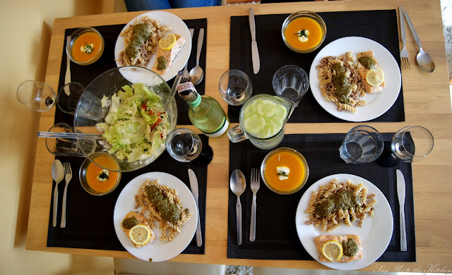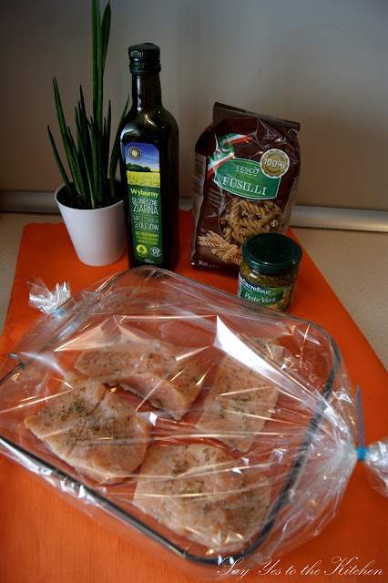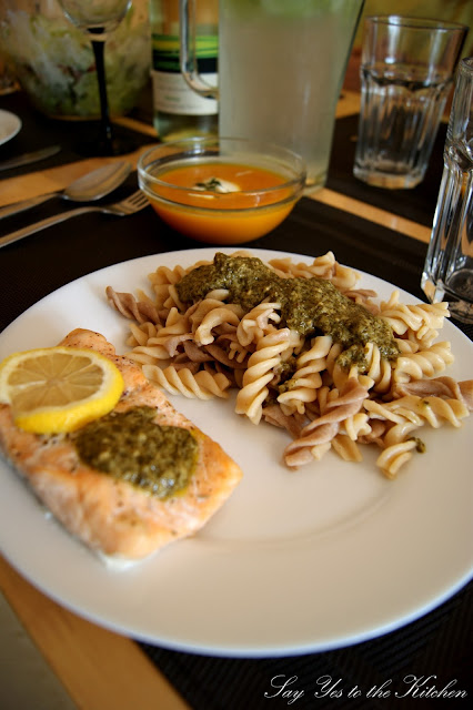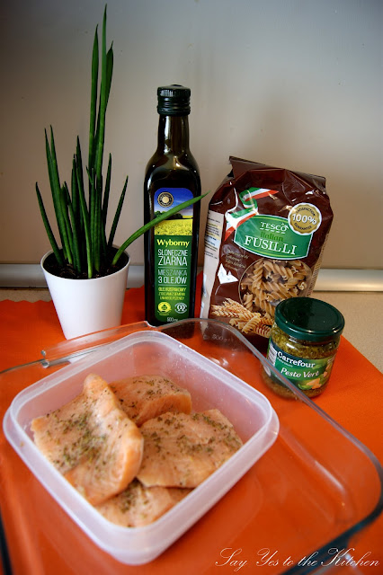 °C i pieczemy przez 30- 40 minut. W międzyczasie gotujemy makaron oraz podgrzewamy nasze pesto. Gdy już wszystko będzie gotowe, łososia wykładamy na talerz dekorujemy kleksikiem z pesto, oraz plasterkiem cytrynki, obok makaronu z resztą sosu pesto. Smacznego :-)!