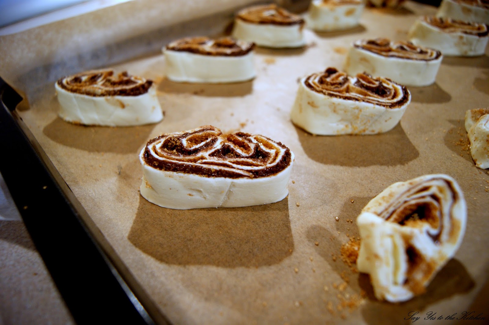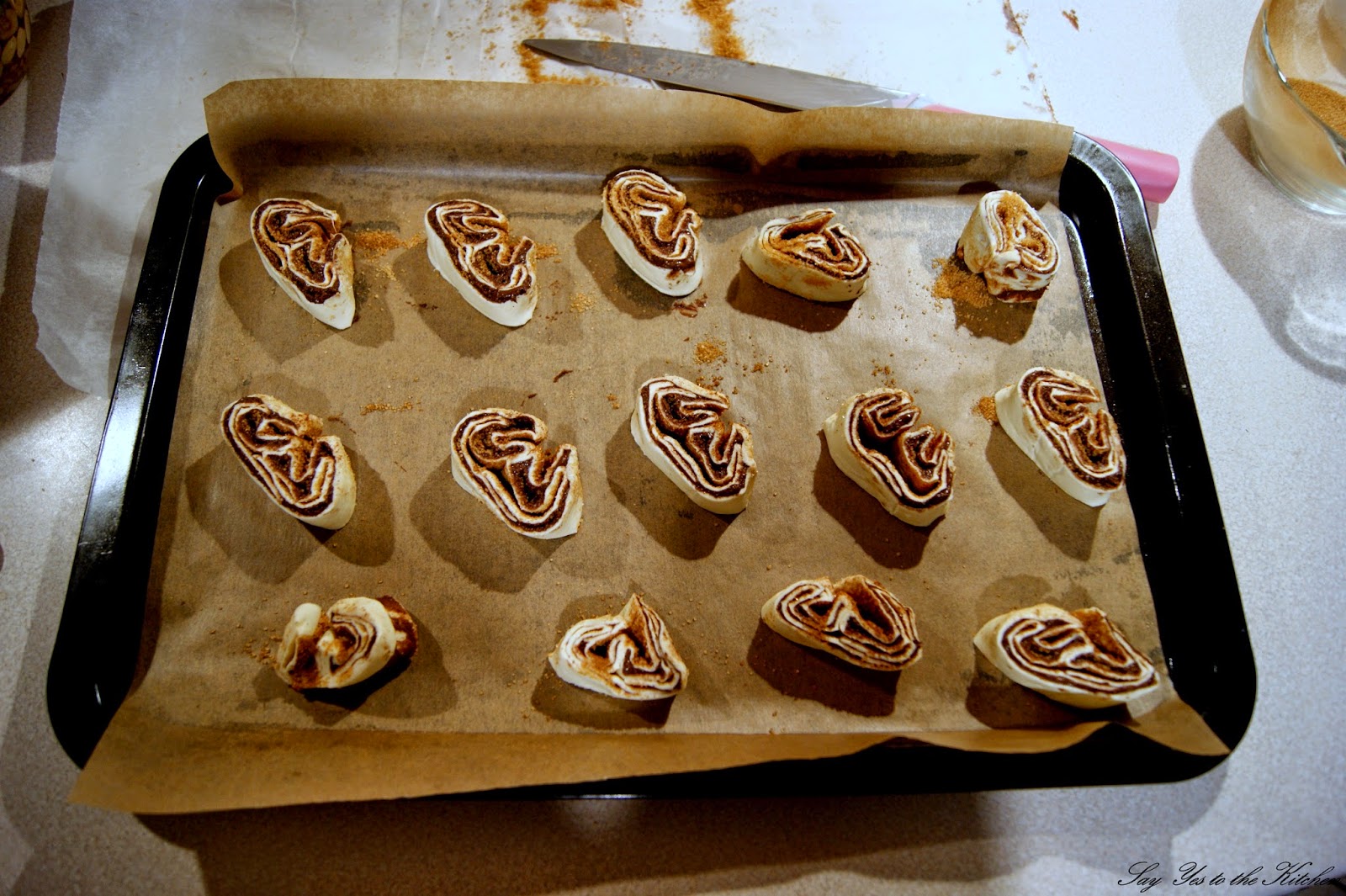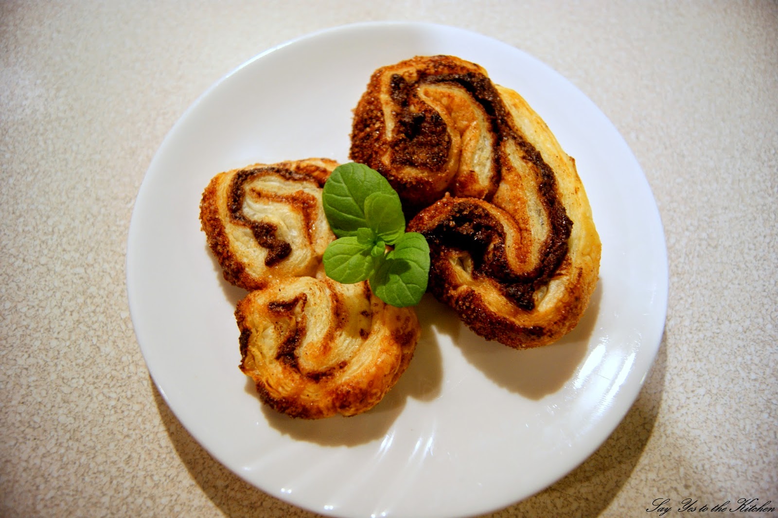 Cukier mieszamy z cynamonem i ziarenkami wanilii . Rozkładamy ciasto francuskie na blaszce wyłożonej papierem do pieczenia. Tak przygotowane ciasto smarujemy Nutellą, i posypujemy przygotowaną mieszanką. Składamy boki do połowy ciasta. Czynność powtarzamy i składamy ciasto jak książkę i kroimy w centymetrowe plasterki. Układamy na przygotowanej blaszce, w dość dużych odstępach od siebie.