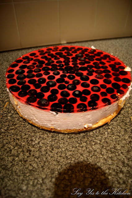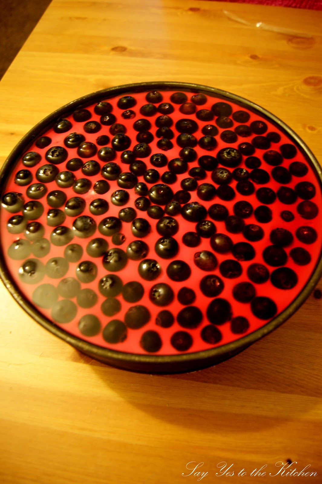 Galaretki rozpuszczamy w 400 ml wrzątku, studzimy- kiedy zacznie tężeć mieszamy ją z twarogiem i cukrem. Przygotowaną masę serową wykładamy na biszkopt, następnie układamy borówki i całość odstawiamy do lodówki na godzinę. Ostatnim krokiem będzie przygotowanie