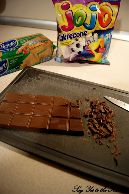 Czekoladę siekamy na małe kawałki. Wysypujemy ją na dno naszego naczynia żaroodpornego- wykładamy pianki. Ja użyłam owocowych, ponieważ akurat te były dostępne w moim sklepie. Jeśli ktoś ma dostęp do "Amerykańskich" pianek, śmiało można je zastąpić. Tak przygotowany deser, wkładamy do piekarnika nagrzanego do 180 °C. termoobieg). Po mniej więcej 20 minutach nasza cukrowa bomba będzie gotowa, ale zależy do od każdego piekarnika indywidualnie, więc gdy pianki zaczną się przypiekać należy je wyciągnąć. Gorący wręcz deser serwujemy z herbatnikami, które maczamy w naszym S'mores dip.