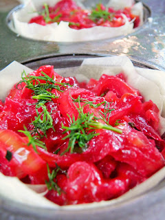 Powodem, dla którego te babeczki powstały były buraczki, na które jakoś nie znalazłam wcześniej pomysłu. Olśniło mnie dziś, by połączyć je z pysznym duszonym porem i wykorzystać jako farsz. Zresztą takie nadzienie można wykorzystać w różnych daniach, choćby w lasagne czy nawet pierogach.