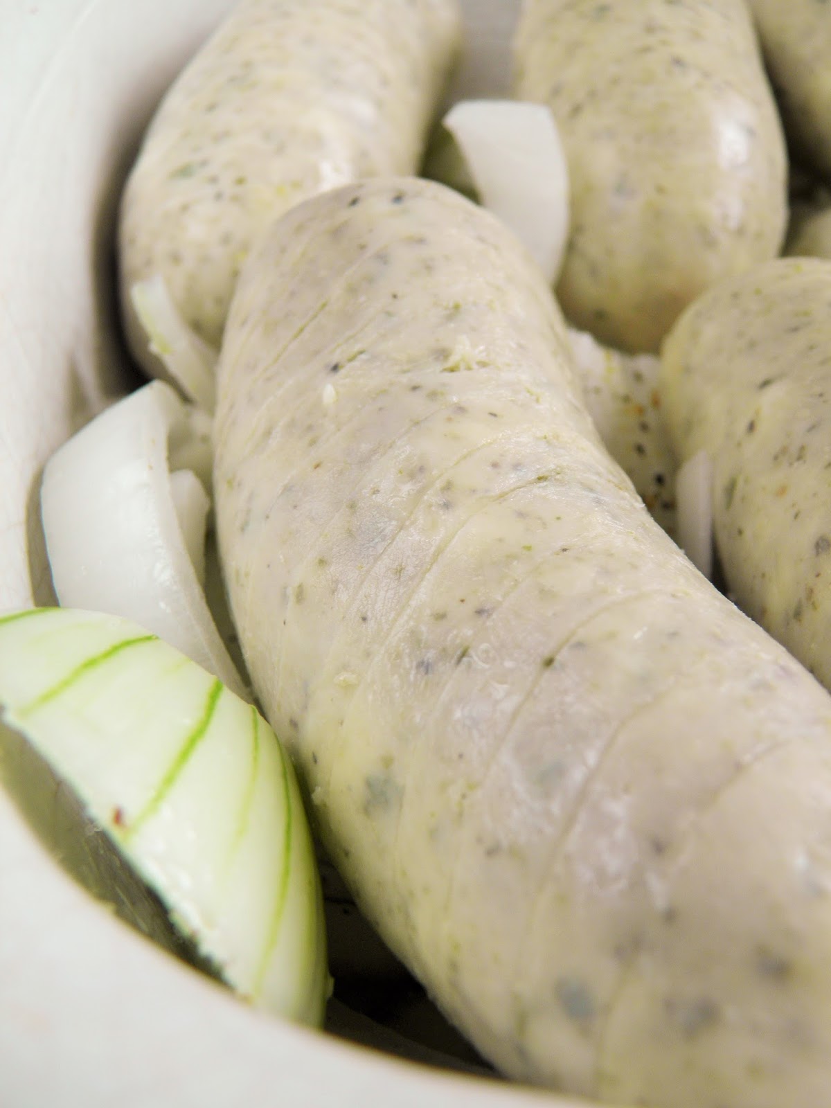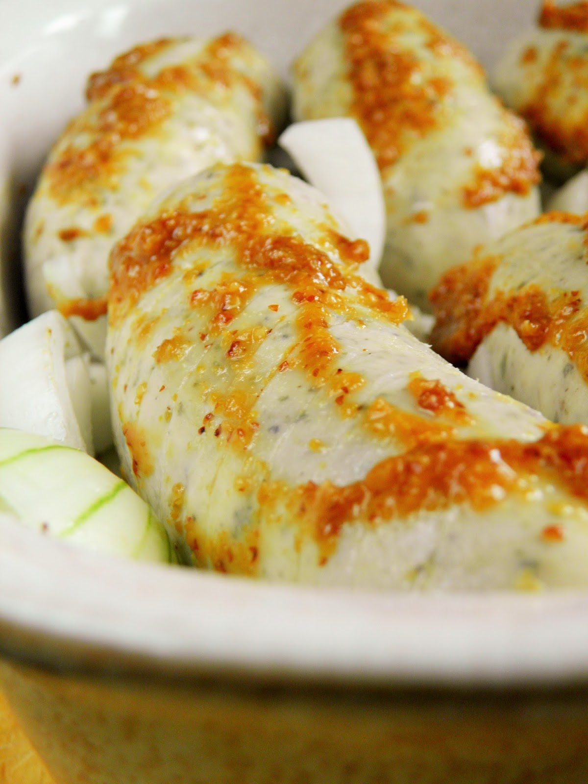 Biała kiełbasa pieczona Biała kiełbasa pieczona z cebulą i czosnkiem pyszna, miękka i aromatyczna. Idealna nie tylko na Wielkanocne śniadanie. W moim domu często pojawia się w ciągu roku, jako ciepłe śniadanie z dodatkiem sosu chrzanowego, z mu...