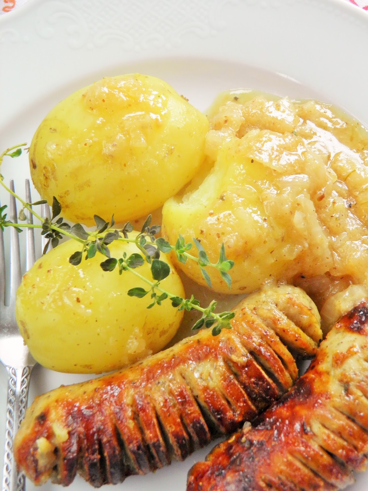 Biała kiełbasa pieczona w iwie z miodem i pieczarkami