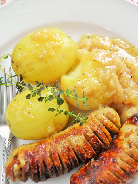 Kiełbaska bardzo nam smakowała. Pierwszy raz upiekłam ją z piwem - muszę przyznać, że to ciekawy sposób; nabrała bardzo fajnego smaku, jest delikatna, z lekko wyczuwalną nutą musztardy. Danie dobrze mi się kojarzy, bo przywodzi na myśl wakacyjny klimat.