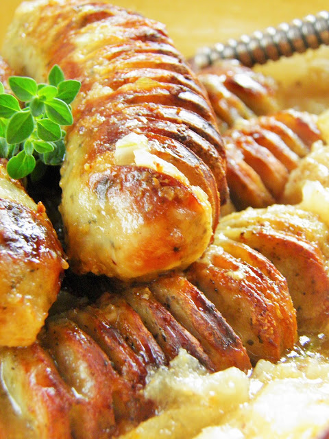 Biała kiełbasa z piekarnika, pieczona z ziemniakami, boczkiem i cebulą.