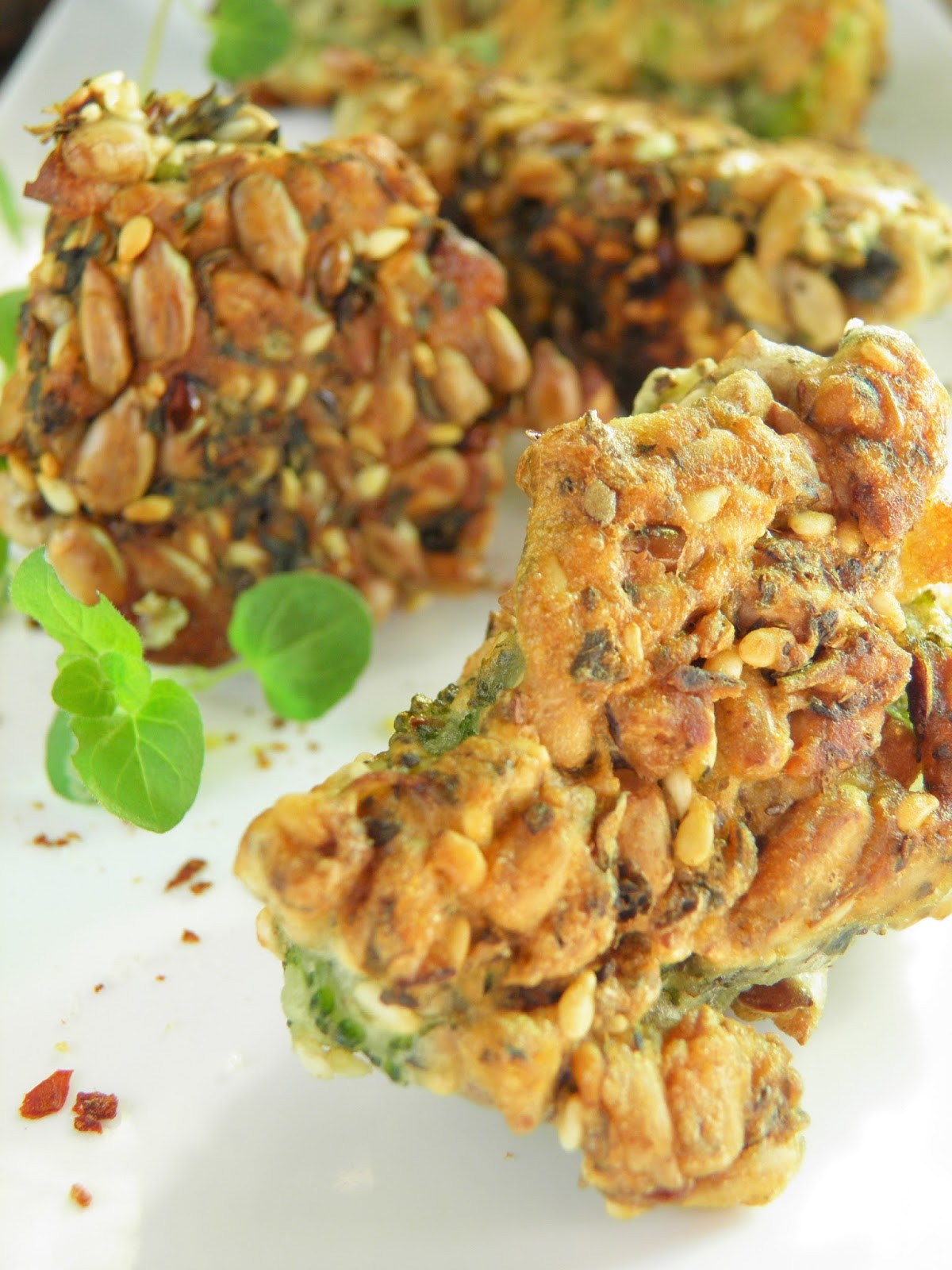 Ale na razie mam dla Was pyszną przekąskę: podgotowane kawałki brokuła usmażyłam w cieście i chrupiących po usmażeniu ziarenkach słonecznika, sezamu i siemienia lnianego, na dodatek cudownie doprawionych ziołami. Użyłam gotowej mieszanki