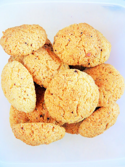 Odmieniłam nieco nasze ukochane ciasteczka ryżowe, bo większą część wiórków kokosowych zastąpiłam mielonymi orzechami laskowymi, dzięki czemu