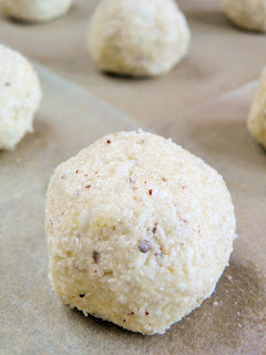 Miękkie masło ucieram mikserem z cukrem (nie musi być całkiem gładka masa), dodaję żółtka, szczyptę kwasku cytrynowego i proszek do pieczenia. Ucieram jeszcze chwilę, po czym dosypuję orzechy, kleik i wiórki, mieszam łyżką. Ubijam białka na sztywną pianę ze szczyptą soli, przekładam do masy i dłonią mieszam do połączenia. Formuję kulki wielkości orzecha włoskiego, układam je na blachach wyłożonych papierem do pieczenia i wstawiam do piekarnika nagrzanego do 180 stopni C. (góra-dół) na 25- 30 minut.