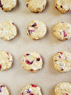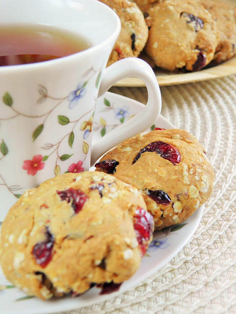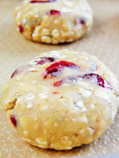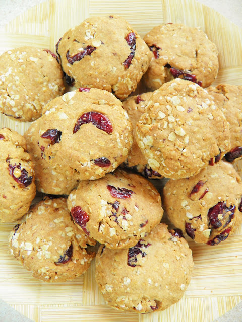 Składniki na ok. 20 sztuk:1 szklanka mąki pszennej 50 g. zimnego masła1 żółtko1 łyżeczka proszku do pieczenia2 pełne łyżki powideł śliwkowych3-5 łyżek suszonej żurawinyok. 1 szklanki drobnych płatków owsianychPrzygotowanie: Wszystkie składniki - w tym połowę płatków - przekładam do miski (masło ścieram na grubej tarce) i zagniatam ciasto. Będzie się lekko kleiło do rąk, więc dodaję stopniowo pozostałe płatki do momentu, aż ciasto da się ładnie zagnieść w kulę. Dzielę ciasto na porcje wielkości dużego orzecha włoskiego, robię z nich kulki a potem je spłaszczam. Układam tak przygotowane ciasteczka na blasze wyłożonej papierem i piekę przez 20 minut temperaturze 185 stopni C., potem zmniejszam temperaturę do 170 stopni C. i piekę jeszcze 10 minut. Przepis autorski.