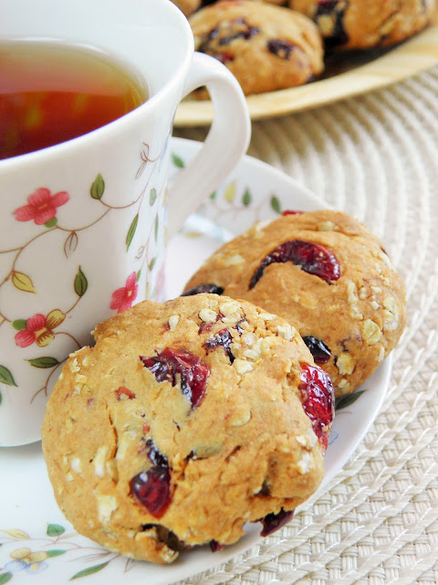 Przypomniało mi się że dawno temu piekłam ciasto, którego składnikiem był dżem, a że wczoraj miałam ochotę na jakieś ciasteczka, pomyślałam żeby spróbować tego samego. Dodałam do ciasta powidła śliwkowe, które oprócz tego że wiążą pozostałe składniki zastępują cukier (bo przecież same w sobie są już wystarczająco słodkie). Ciasteczka są dość chrupiące, z rodzaju tych twardszych, idealnych do herbaty.