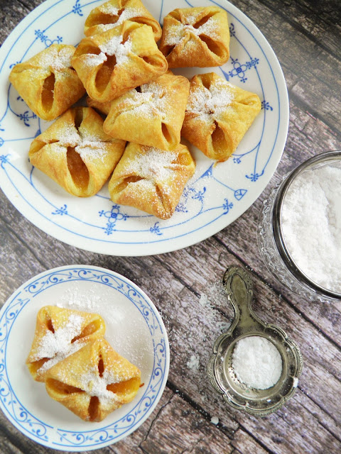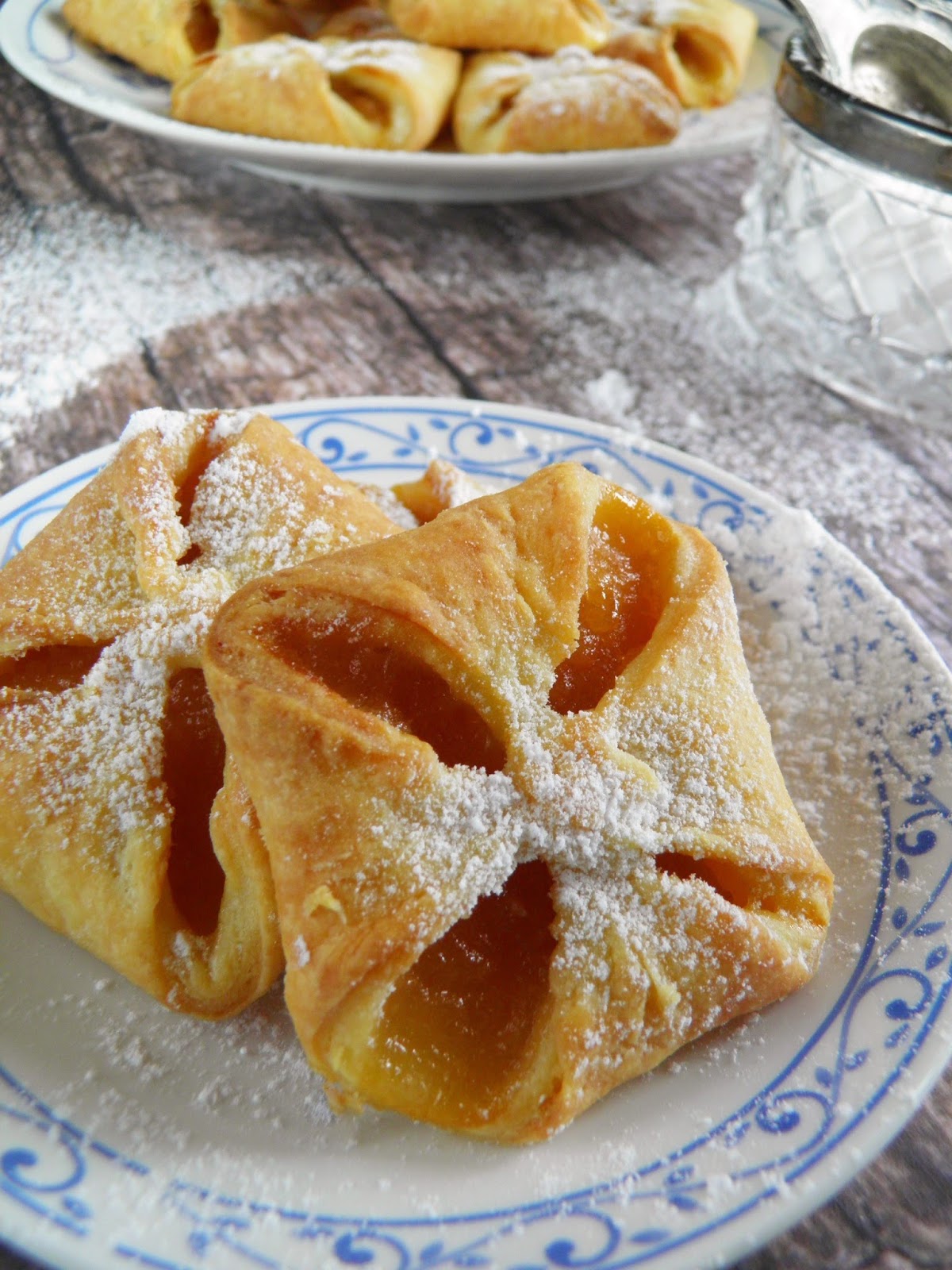 Składniki na ok. 45 sztuk:2,5 szklanki mąki pszennej + do podsypania6 łyżek cukru waniliowego370 g. zimnego masła500 g. twarogu, dwukrotnie lub trzykrotnie zmielonegomus jabłkowy (prażone jabłka, np. takie)Przygotowanie:Przesiewam mąkę do dużej miski, dodaję masło w kawałkach i siekam je jak najdrobniej nożem. Dodaję cukier waniliowy oraz twaróg i zagniatam elastyczne ciasto, aż będzie gładkie i jednolite. Odkładam ciasto do schłodzenia na ok. godzinę, po czym rozwałkowuję je na grubość 3 mm i dzielę na kwadraty 8 x 8 cm. Na środek każdego kwadratu nakładam łyżeczkę musu, a następnie sklejam wszystkie rogi - trzeba to zrobić bardzo solidnie. Ciastka przekładam na blachę wyłożoną papierem, można je też posmarować mlekiem, żeby były błyszczące. Piekę ok. 22-25 minut w temperaturze 165 stopni C (termoobieg) lub 25-30 minut w temperaturze 180 stopni C. (góra-dół). Po lekkim przestudzeniu posypuję je pudrem.