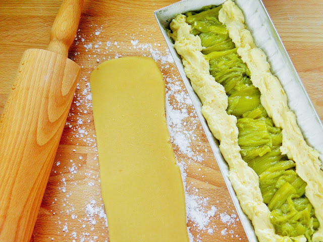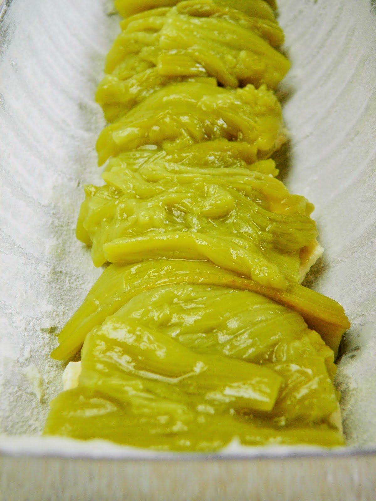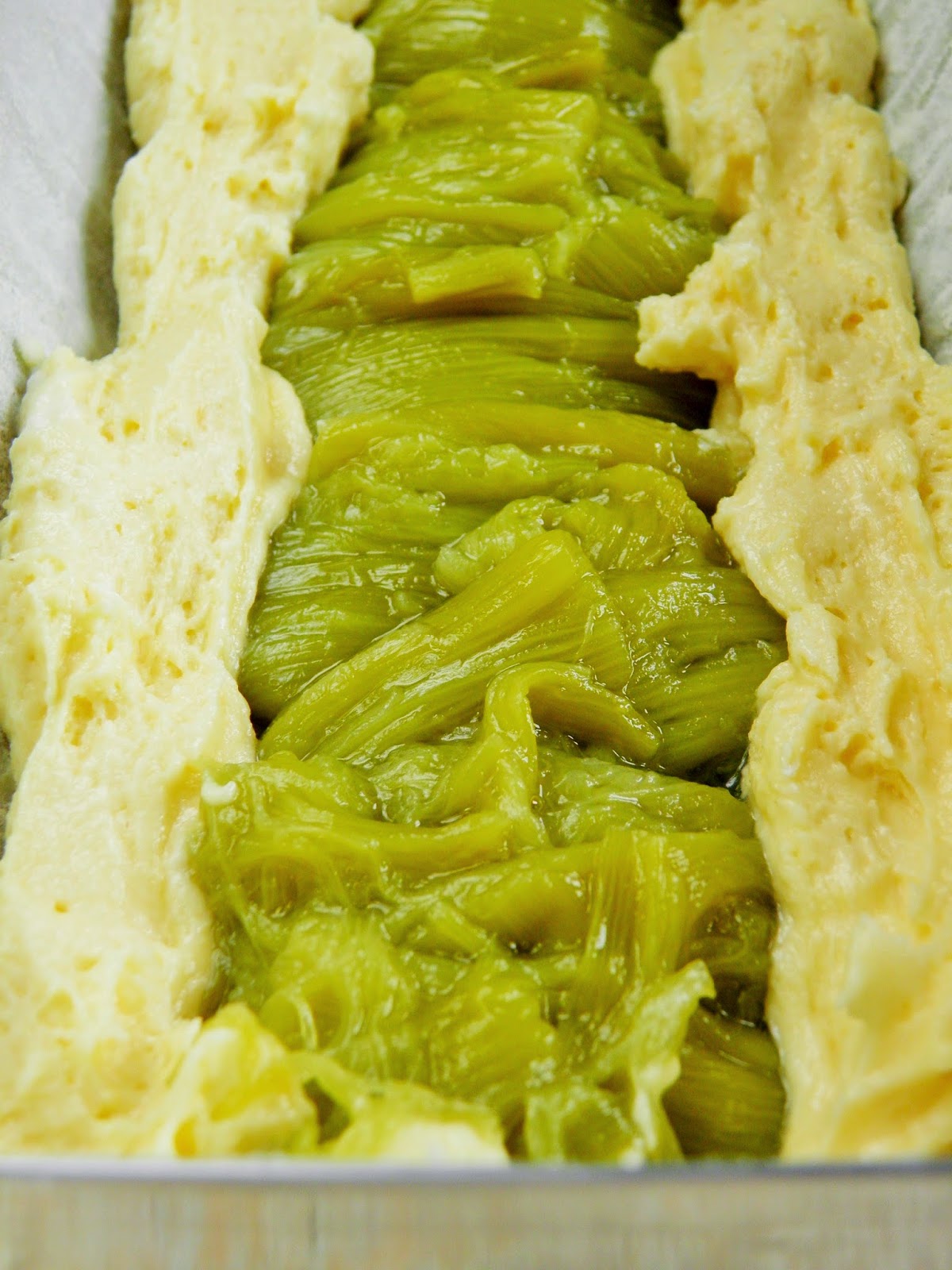 Foremkę do cwibaka (keksówkę) dokładnie smaruję masłem i oprószam mąką. Na dno foremki wykładam pasek ciasta, a na niego rabarbar. Uzupełniam boki ciastem, jak na zdjęciu. Masę marcepanową wałkuję (na stolnicy podsypanej cukrem pudrem) na prostokąt wielkości foremki, wykładam ją na rabarbar. Przykrywam pozostałym ciastem, wygładzam powierzchnię i wstawiam blaszkę do piekarnika nagrzanego do 185 stopni C. (góra-dół) na 40-45 minut. Jeśli góra ciasta zbyt się spieka, można przykryć je papierem.