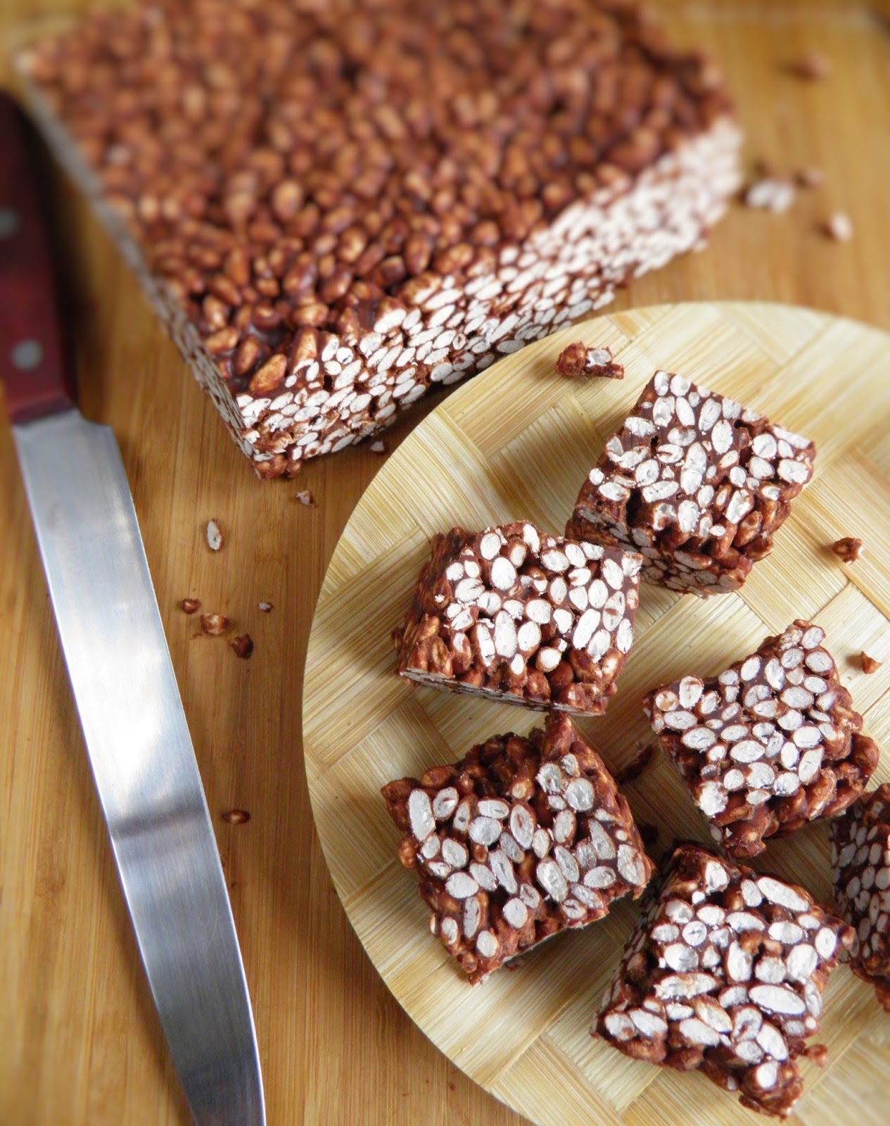 Składniki (kwadratowa forma 15 x 15 cm):180 g. masła0,5 szklanki cukru5 łyżek mleka skondensowanego1 łyżka kakao1,5 tabliczki czekolady deserowejpreparowany ryż - do skutku ;)Przygotowanie:W rondlu z grubym dnem rozpuszczam masło z mlekiem, cukrem i kakao, podgrzewam aż zrobi się jednolita masa. Zdejmuję garnek z ognia i dodaję czekoladę w kawałkach. Mieszam wszystko do jej rozpuszczenia, a potem lekko schładzam. Następnie wsypuję ryż i mieszam - taką ilość, by nie było widać masy, a każde ziarenko się nią okleiło. Przygotowuję formę: wykładam dno i boku folią spożywczą. Wykładam zawartość rondla, ładnie wyrównuję i odstawiam na noc do lodówki.