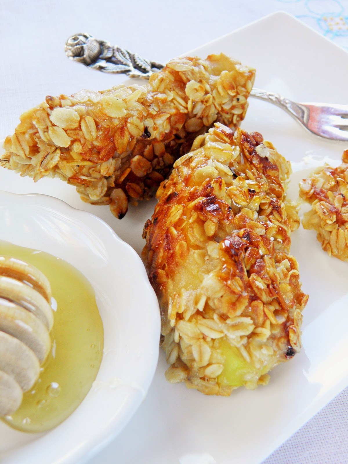 Dokładnie mieszam składniki ciasta, by powstała gęsta masa. Umyte jabłko kroję na ósemki, pozbawiam je gniazd nasiennych. Panieruję jabłka w cieście i w płatkach i przekładam na patelnię z rozgrzaną niewielką ilością oleju. Ciasto będzie lekko spływało, dlatego najpierw obsmażam jabłko z obu stron, a dopiero potem dosmażam. Gdy panierka jest rumiana i chrupiąca, przekładam na chwilę usmażone jabłka na talerz z ręcznikiem papierowym - do odsączenia nadmiaru tłuszczu. Podaj polane miodem.