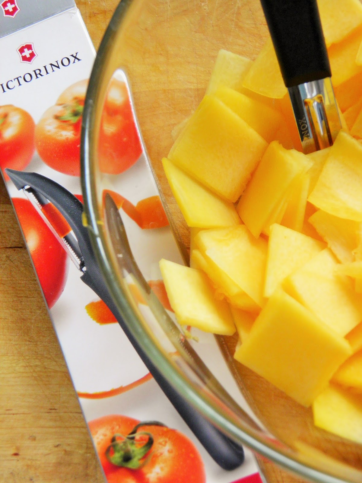 Przygotowanie jest banalnie łatwe, trzeba tylko pokroić pora i dynię, wrzucić je na patelnię i cierpliwie, na niewielkim ogniu, poddusić. Użyłam do krojenia dyni obieraczki do warzyw