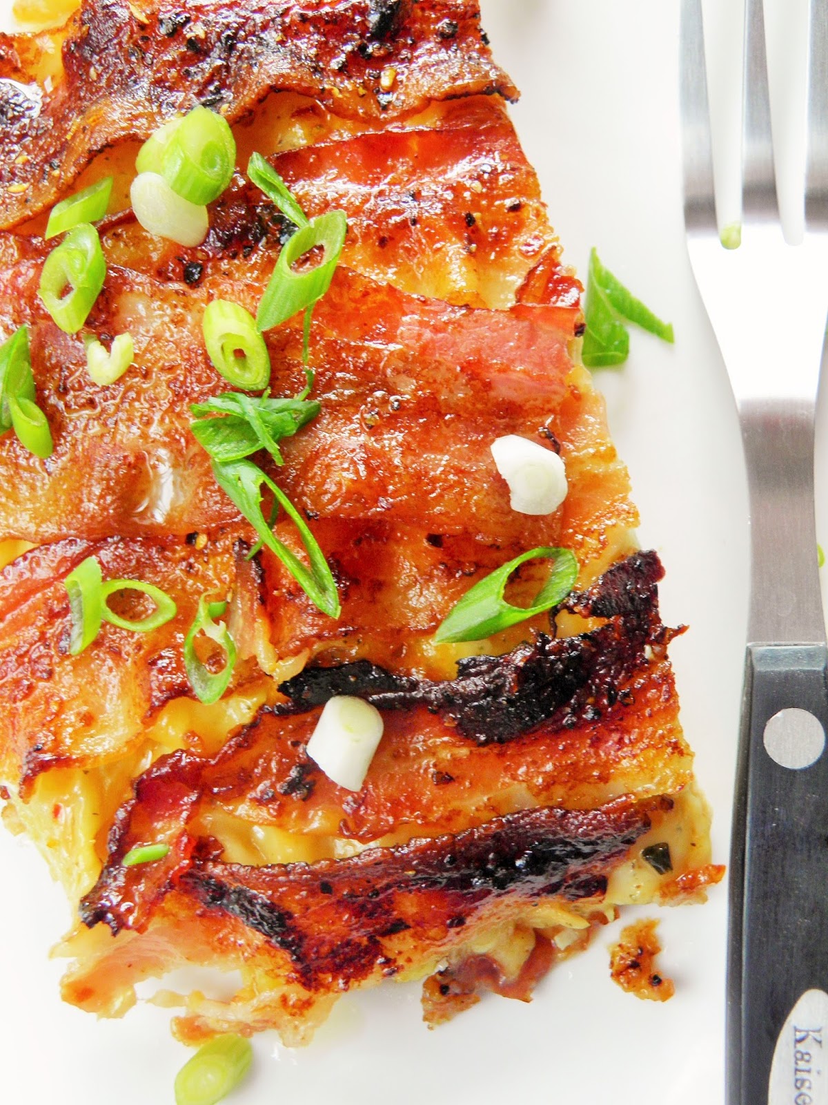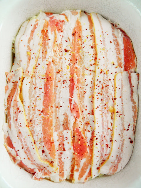 Odcinam końcówki fasolki, układam połowę jako pierwszą warstwę w lekko natłuszczonym naczyniu do pieczenia, oprószam ją solą i pieprzem, ewentualnie suszoną bazylią. Na fasolę wsypuję 1/3 sera, układam plastry pomidora i wędliny. Posypuję kolejną częścią sera, układam resztę fasolki, także ją lekko doprawiam. Wykładam pozostały ser, a całość przykrywam plastrami boczku. Wstawiam do piekarnika nagrzanego do 210 stopni C. na ok. godzinę - w międzyczasie sprawdzam, czy fasolka jest już miękka. Podaję z posiekanym szczypiorkiem i np. jajkiem sadzonym.