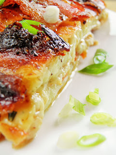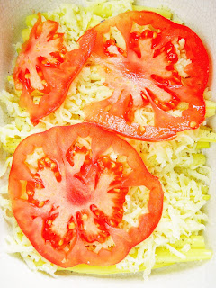 Fasolka szparagowa, mozzarella, szynka, pomidor i chrupiący boczek - w formie zapiekanki. Zjedliśmy ją dodatkowo z jajkiem sadzonym. Bardzo pyszne i ciekawe danie, zachęcam do wypróbowania !
