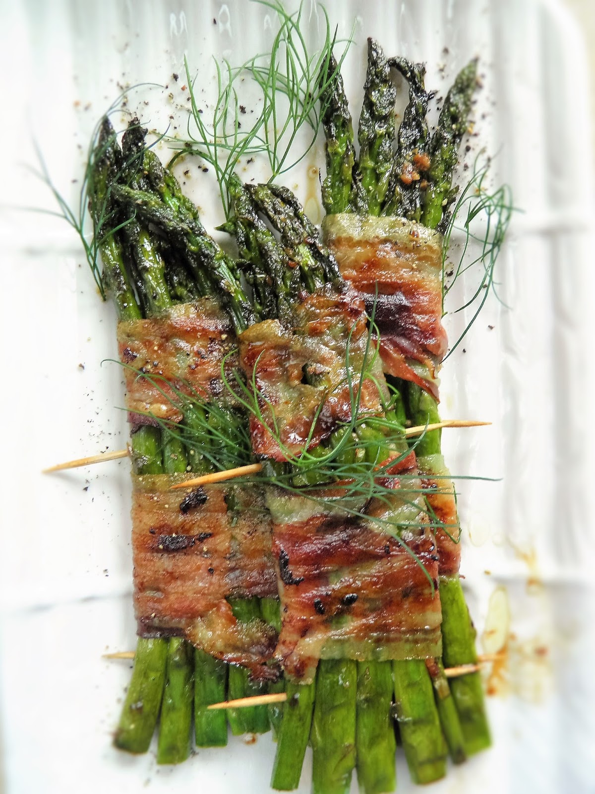 Na śniadanie, obiad lub kolację. Grillowane na gaziew ceramicznej formie. Zielone szparagi. Posypane boczkiem.Uzupełnieniem dania może być sadzone jajko