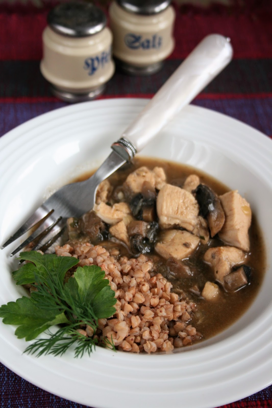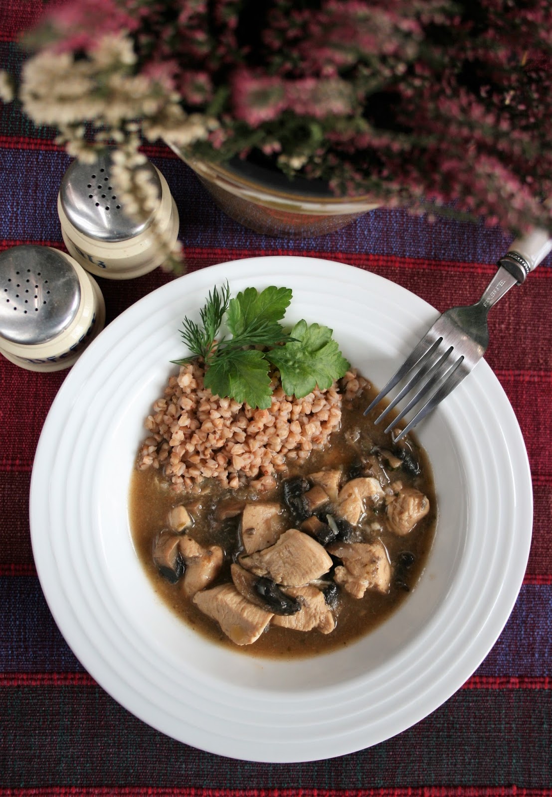 Bardzo odchudziłam mój gulasz, bo zarówno mięso jak i pieczarki nie były smażone. Doprawiłam go ziołami i odrobiną czosnku, i lekko zagęściłam mąką. Pysznie smakuje z kaszą gryczaną.