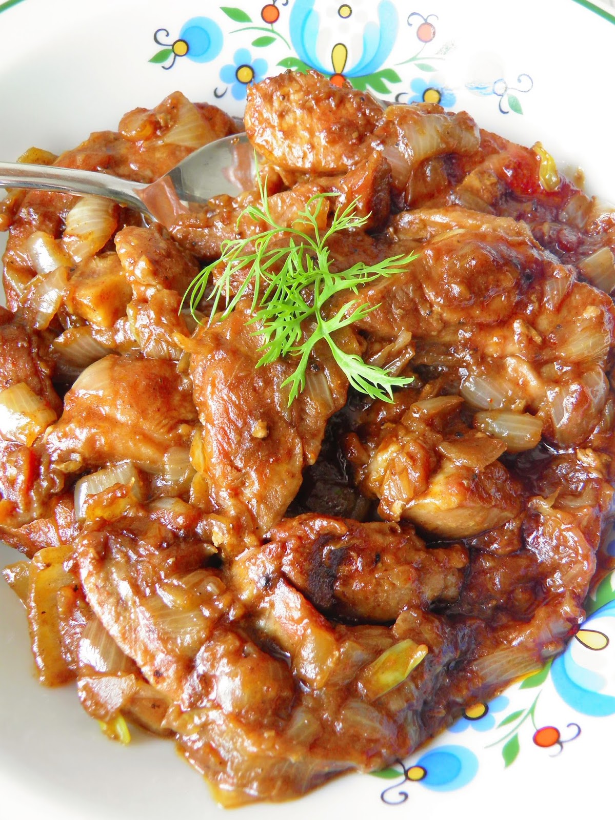 Intensywna i bardzo ciekawa w smaku wersja indyka - udziec w kawałkach udusiłam z dużą ilością cebuli, z dodatkiem słodkiej papryki i cynamonu, trochę na kształt czeskiego gulaszu.