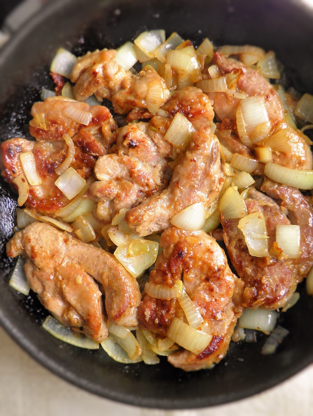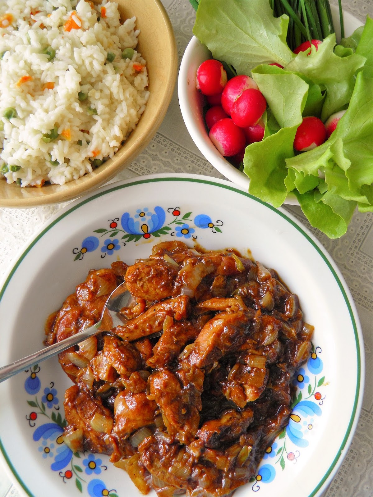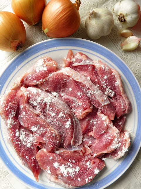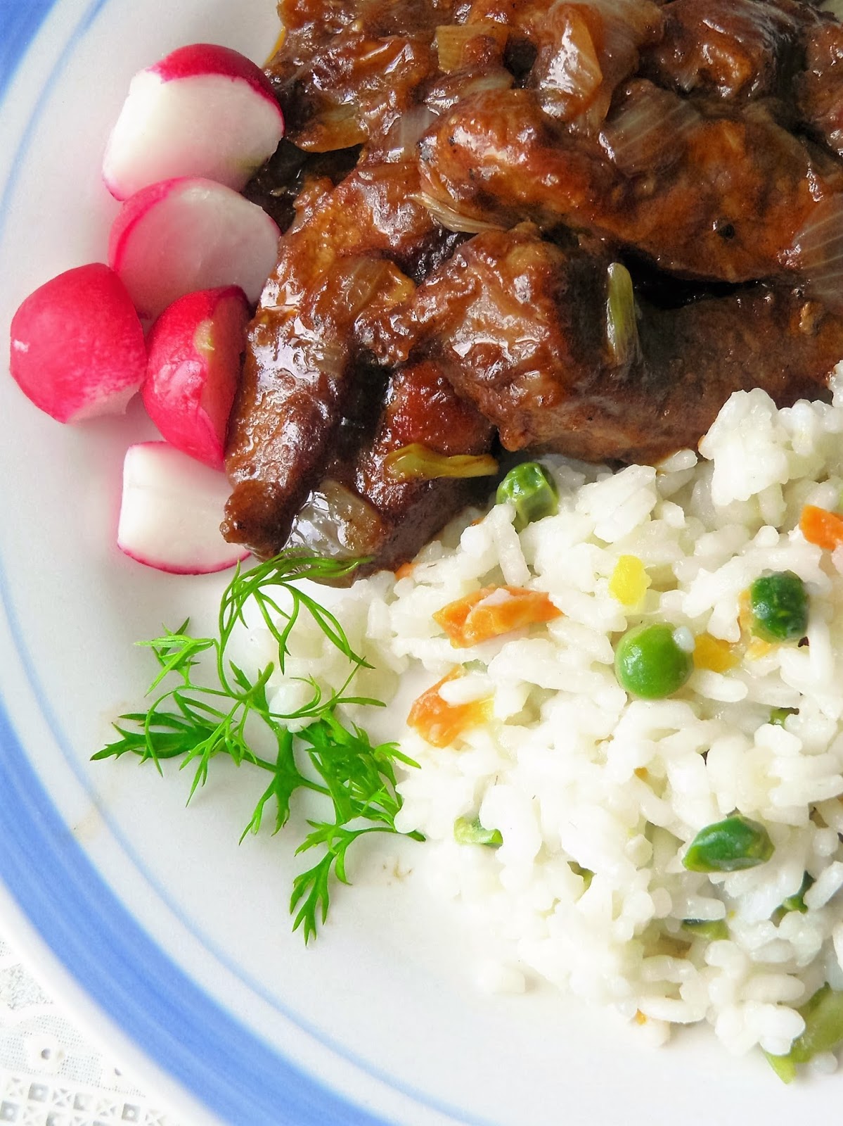 Umyte i osuszone mięso kroję w plastry, oprószam solą, cukrem i mąką, smażę na mocny rumiany kolor na oleju (w 2 albo 3 partiach). Całe podsmażone mięso przekładam z powrotem na patelnię, dodaję pokrojoną w kostkę cebulę, lekko całość i pod przykryciem smażę na wolnym ogniu do zeszklenia cebuli. Dolewam sos sojowy i całość doprawiam do smaku szczyptą cynamonu, papryką, solą i pieprzem. Duszę pod przykryciem ok. 50 minut, mieszając. Z cebuli powinien wytworzyć się gęsty, aromatyczny sos.