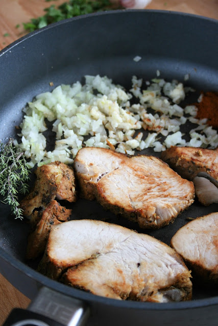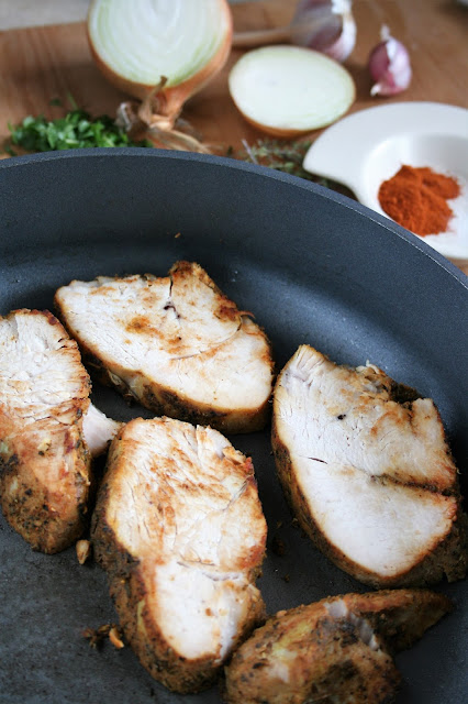Upieczonego indyka kroję na plastry grubości ok. 1,5 cm, przekładam na suchą patelnię z grubym dnem, i smażę na mocno rozgrzanej patelni bez tłuszczu do lekkiego zarumienienia. Następnie odsuwam mięso na jedną stronę patelni, w wolne miejsce wlewam odrobinę oleju i wrzucam nań drobniutko posiekaną cebulę. Smażę ją przez przez minutę, dorzucam czosnek, tymianek i mieloną paprykę; smażę przez chwilę. Całość zalewam wodą i przykrywam. Gotuję 3 minuty. Odlewam kilka łyżek sosu, lekko studzę, mieszam z mąką. Mieszaninę przelewam na patelnię i podgrzewam do zgęstnienia. Dodaję świeży, posiekany lubczyk, doprawiam sos solą i pieprzem.