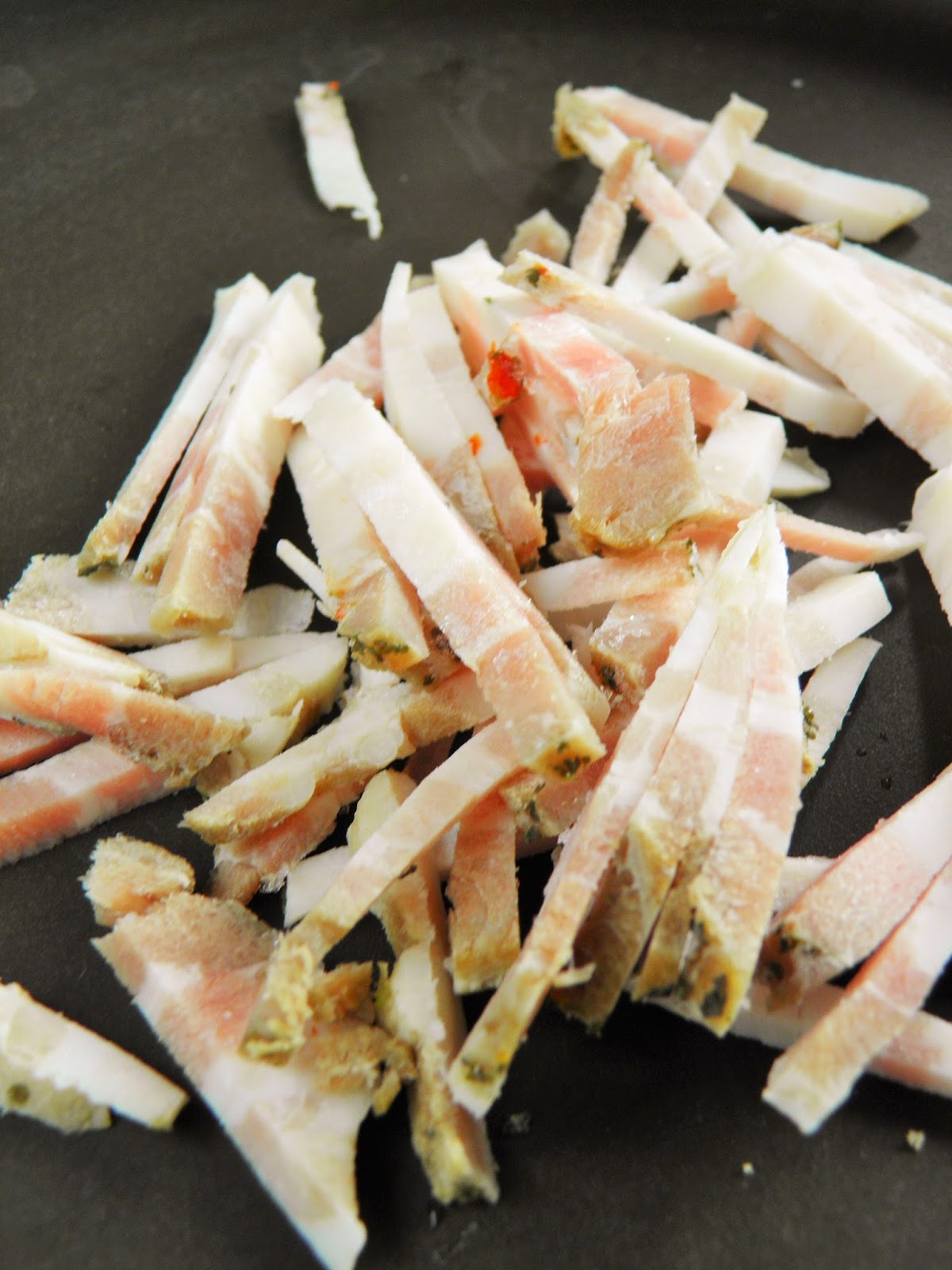 2-3 plastry boczku (użyłam domowego, pieczonego)