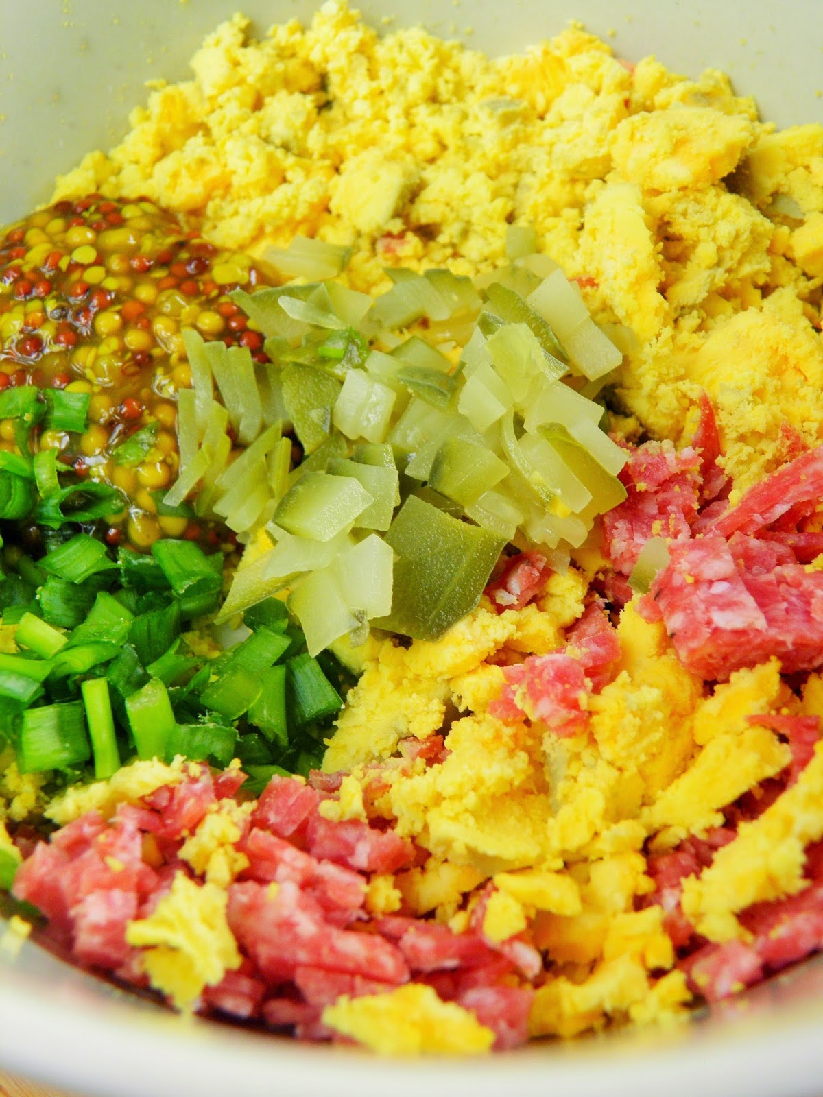 Takie jajka faszerowane dość pikantną pastą z musztardą francuską, ogórkiem i salami świetnie się sprawdzą jako przekąska, mogą być również jednym z elementów Wielkanocnego śniadania.