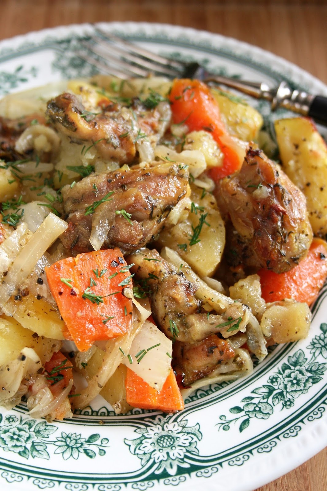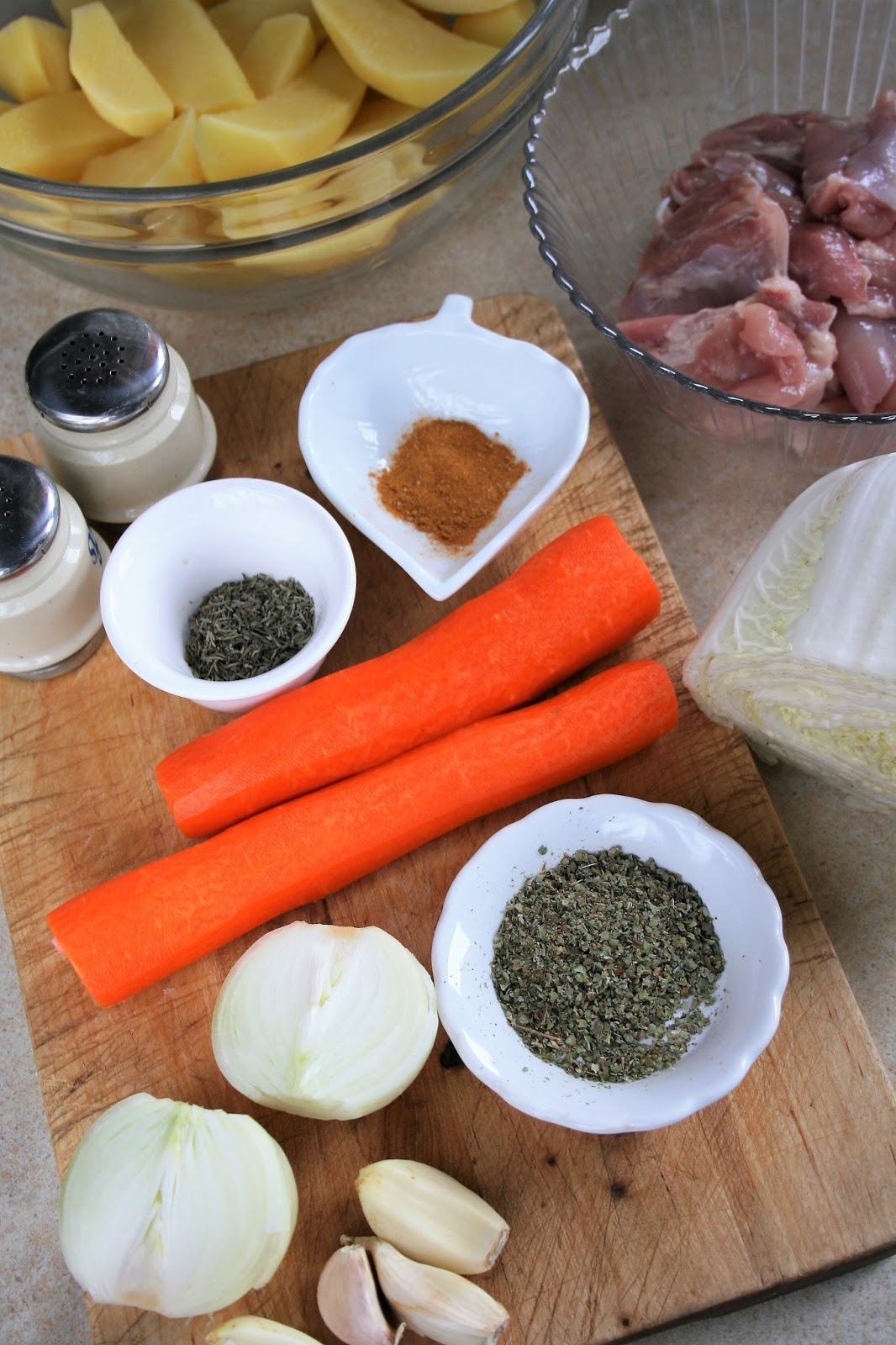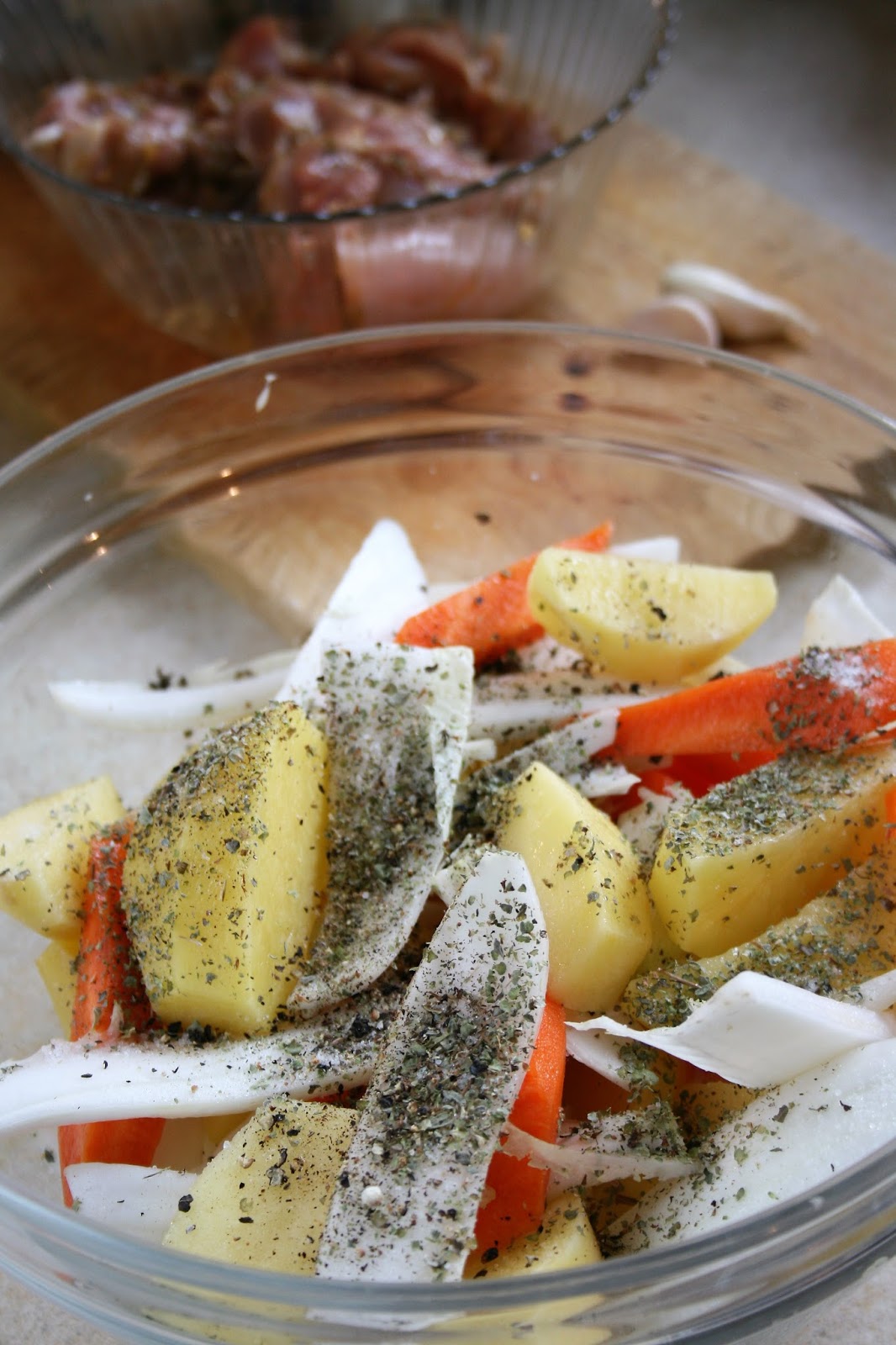 Mięso dzielę na kawałki, i nacieram marynatą, odkładam na pół godziny do lodówki. Ziemniaki kroję na ósemki, cebulę, kapustę i marchewki na kawałki. Warzywa przekładam do miski, dodaję łyżkę oleju, przyprawiam majerankiem, lubczykiem, solą i pieprzem; mieszam dokładnie by pokryły się przyprawami, Na dno naczynia do pieczenia wlewam olej, wykładam warzywa, a na nie mięso. Naczynie szczelnie przykrywam folią aluminiową i wstawiam do piekarnika nagrzanego do 200 stopni C (góra-dół, środkowy poziom piekarnika,bez termoobiegu). Piekę przez ok. godzinę - do miękkości warzyw, a potem zdejmuję folię i piekę jeszcze do zarumienienia mięsa (używam funkcji grilla). Przed podaniem posypuję posiekanym koperkiem.