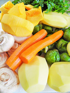 Słońce zagląda mi tu od 2 godzin i to ono właśnie skłoniło mnie do przygotowania kolorowego obiadu. Dużo w nim jesiennych, ciepłych i pięknych kolorów: dynia ze swoją cudną pomarańczową skórką i miąższem, tak samo ruda marchewka, soczyście zielone brukselka i natka pietruszki, złotożółte ziemniaki i pieczarki, również złociste po podsmażeniu. Mogłabym gapić się na to wszystko godzinami, bo tak pięknie się łączą w obraz :)