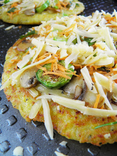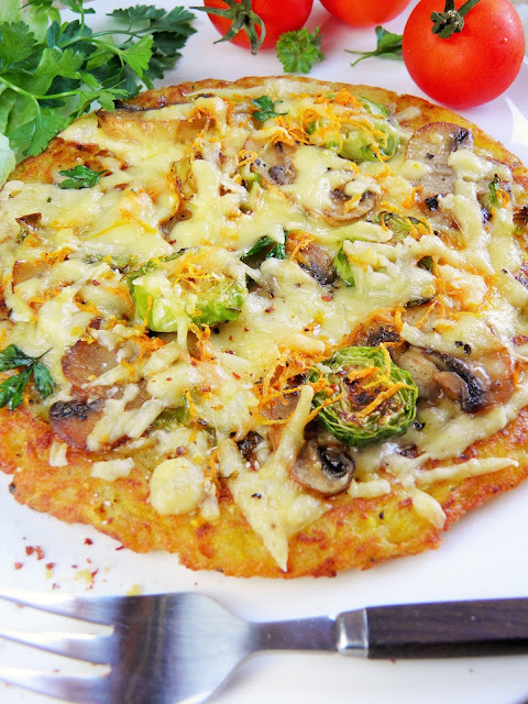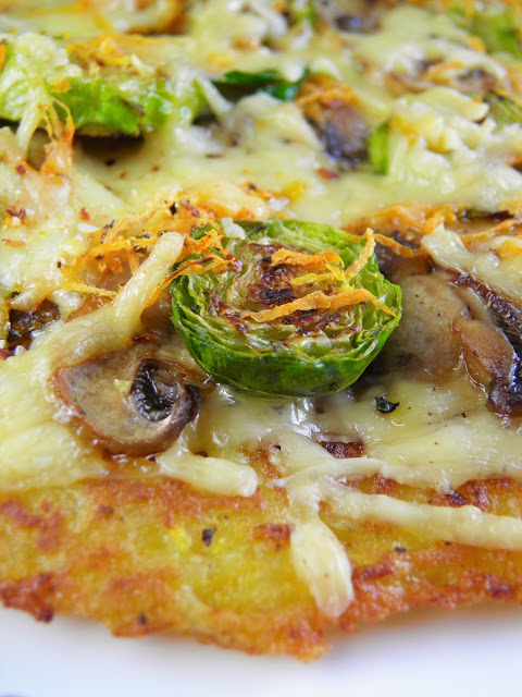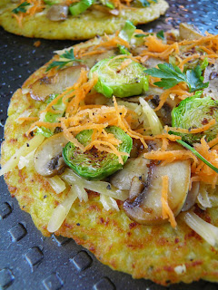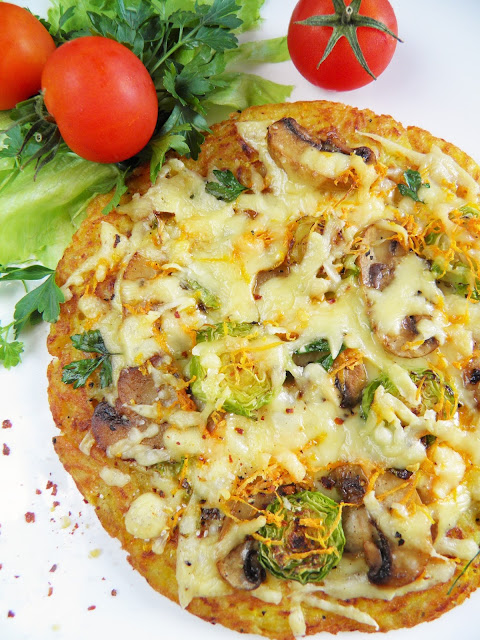 Pieczarki kroję w cienkie plastry, brukselki w grubsze (żeby się nie rozpadały), krótko przesmażam je na patelni z odrobiną oleju. Ścieram obraną marchew na drobnej tarce. Na każdy placek wykładam warstwę sera, na nim układam pieczarki i brukselkę, posypuję startą marchewką i pozostałym serem. Można dodać posiekaną natkę pietruszki. Wszystko lekko oprószam solą i pieprzem i wstawiam do piekarnika nagrzanego do 180 stopni C, piekę do momentu aż ser się rozpuści i zarumieni. Podaję z ketchupem lub ulubionym sosem.