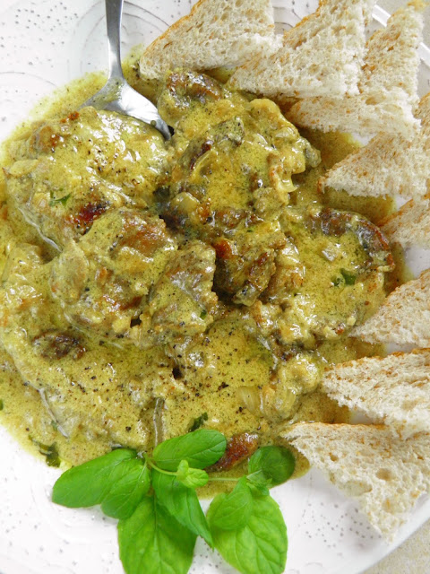 Mięso w tej potrawce jest delikatne i pyszne, a sos to doskonała "maczajka", gęsty i bardzo aromatyczny za sprawą curry i świeżej mięty - i tak polecam wszystkiego spróbować, z chlebem lub bułką które moczymy w sosie.