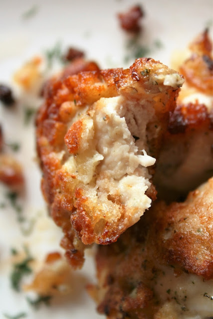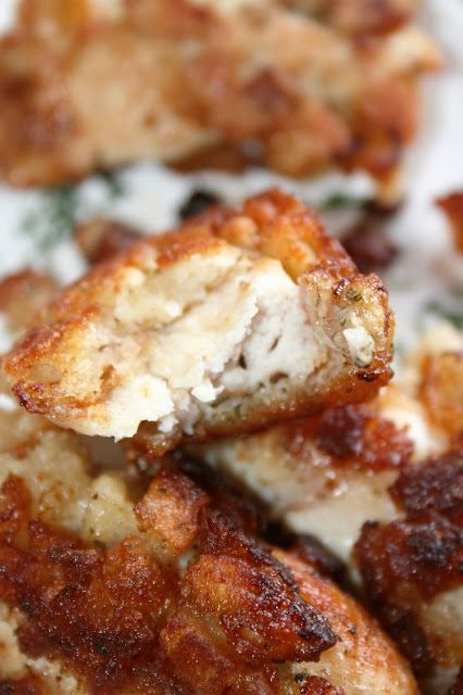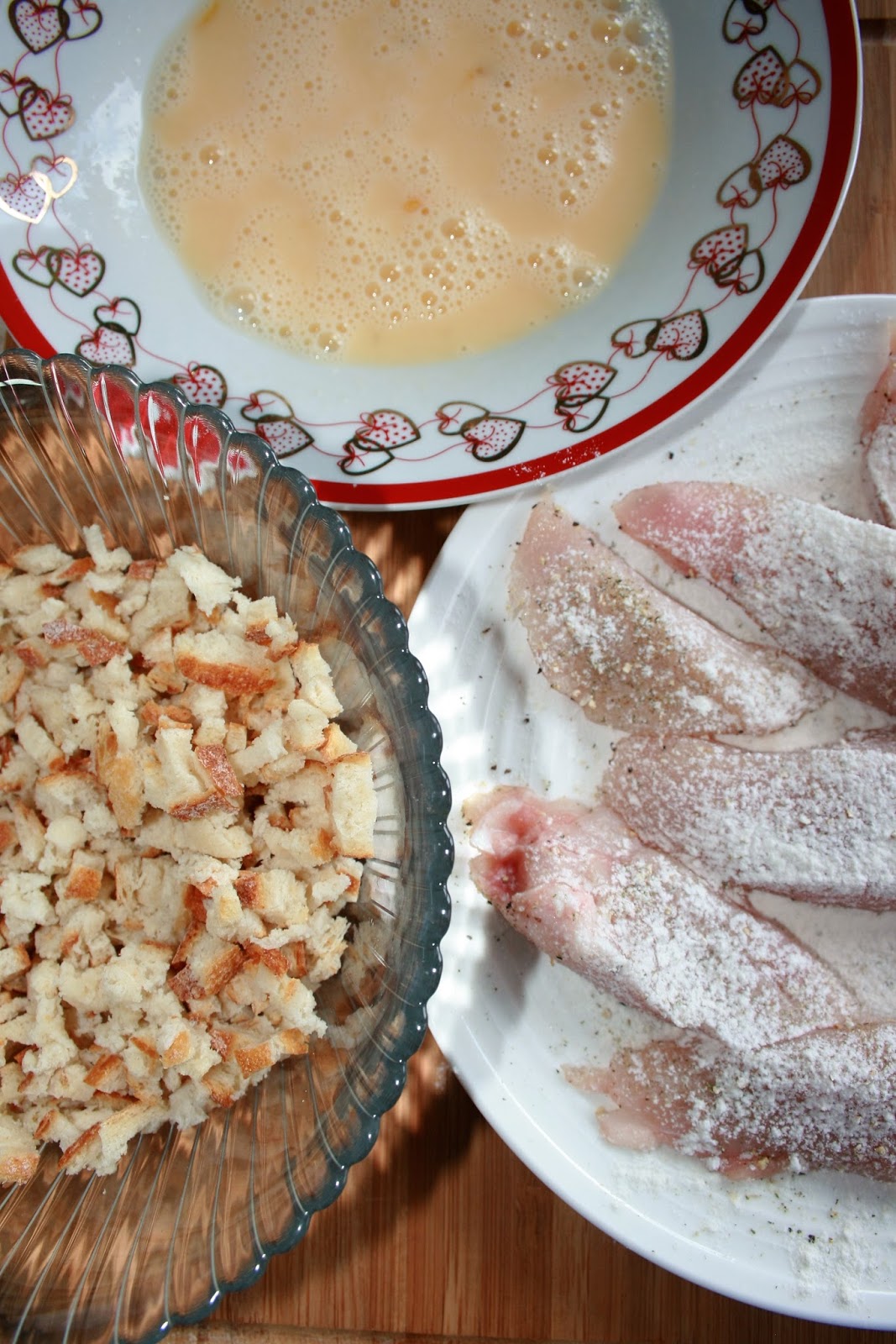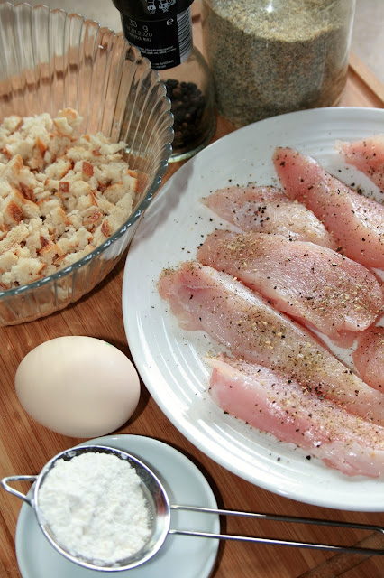 Składniki:2 pojedyncze filety z piersi kurczaka2-3 bułki kajzerki (mogą być zarówno świeże, jak i czerstwe)1-2 jajka1-2 łyżki mlekamąka do oprószenia mięsasól ziołowa, pieprzolej rzepakowy do smażeniaPrzygotowanie:Bułki kroję na bardzo drobną kostkę (im drobniej, tym lepiej) i przekładam je do szerokiej miseczki. Filety kroję na niewielkie kawałki, oprószam je z obu stron solą ziołową i pieprzem, a następnie dość mocno mąką (to najłatwiej zrobić za pomocą sitka). W głębokim talerzu roztrzepuję jajko z odrobiną mleka. Każdy kawałek mięsa zanurzam w jajku, a potem w pokrojonej bułce. Lekko przyklepuje, by jak najwięcej kawałków bułki przykleiło się do mięsa. Tak przygotowane kąski kurczaka smażę na średnio rozgrzanym ogniu na mocno rumiany kolor z obu stron.