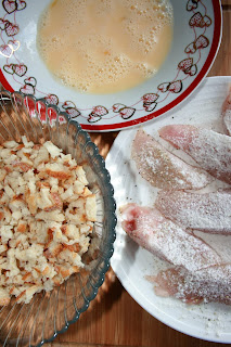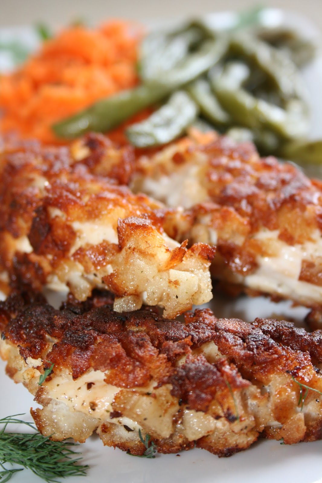 Pyszny obiadek, w sumie niedrogi, a na pewno bardzo łatwy. Małe kawałki fileta z kurczaka doprawiłam pieprzem, solą i ziołami, a potem panierowałam w jajku i drobno pokrojonej bułce pszennej. I właśnie ta bułka decyduje o tym, że panierka robi się niezwykle chrupiąca, a całość - doskonała :)