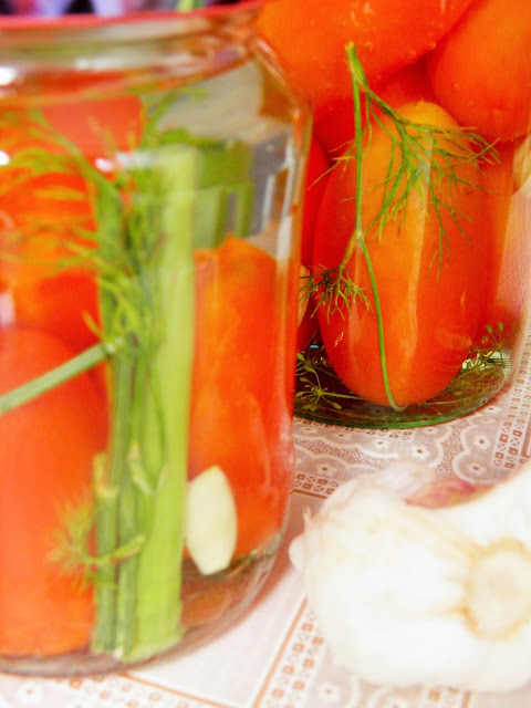 Po raz pierwszy postanowiłam sprawdzić, jak smakują kiszone pomidory - ten sposób ich przetwarzania jest popularny za naszą wschodnią granicą. Kiszone krótko - pozostają jędrne, zyskują jednak już ten charakterystyczny smak. Gdy postoją kilka miesięcy, zmiękną. Będą doskonałe zarówno do zup, sosów, świetnie sprawdzą się w pizzy i w sałatkach.