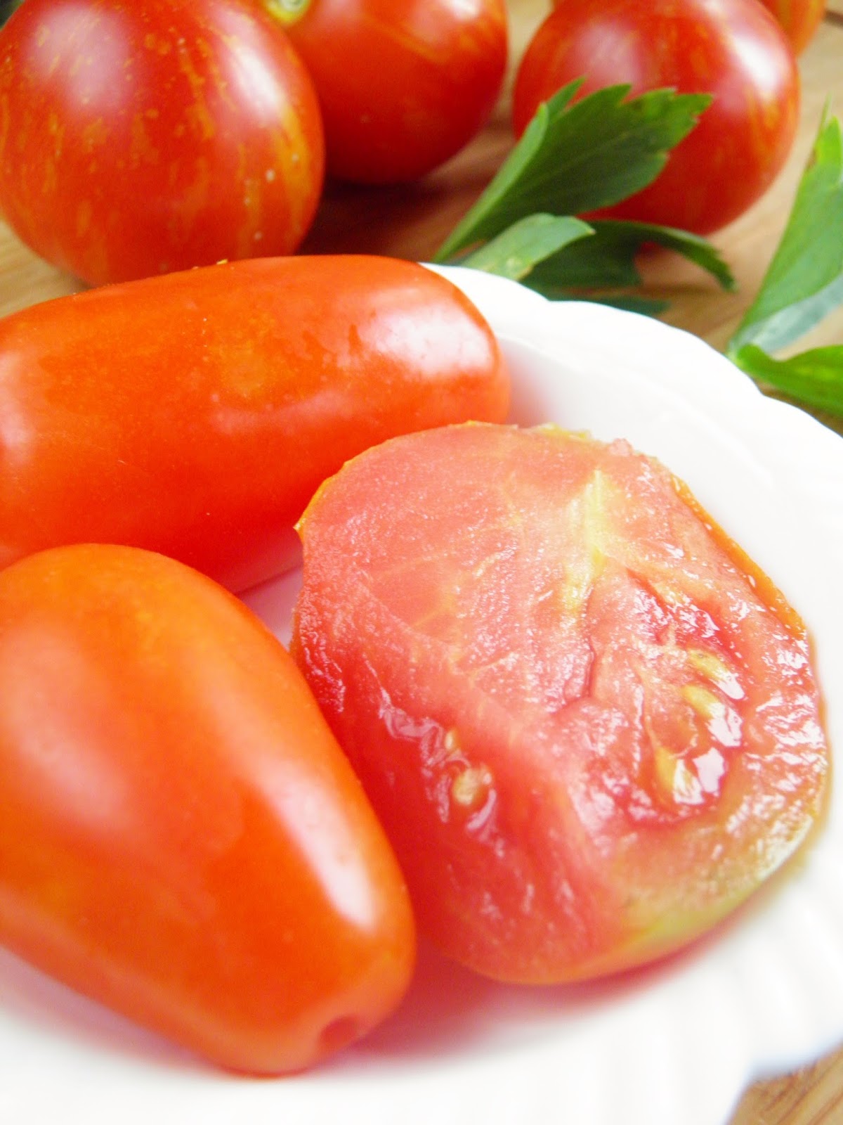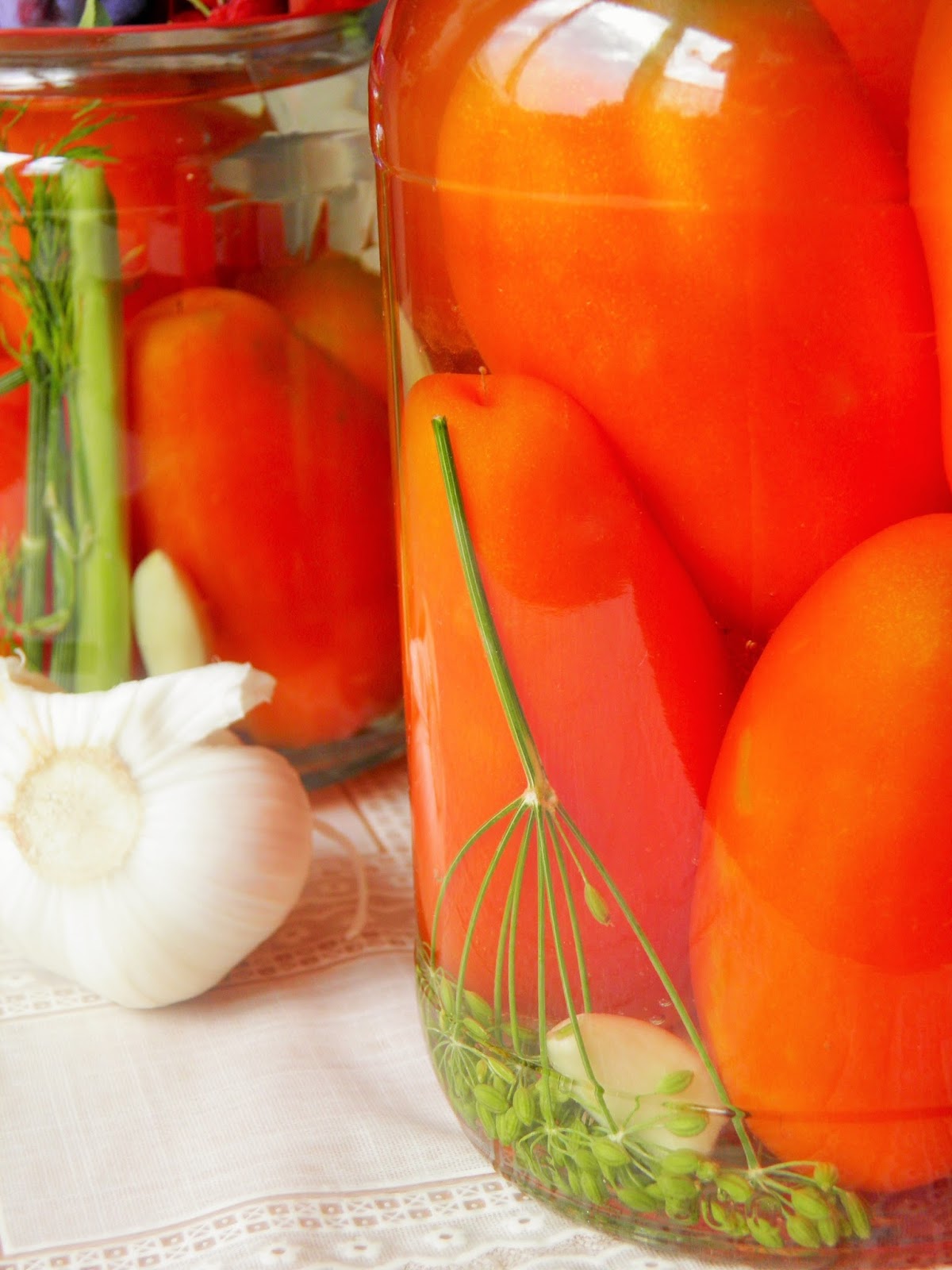 Składniki:pomidory typu lima (twarde, z niewielką ilością pestek, mają dużo miąższu)korzeń chrzanukoper z baldachimamiczosnekliście wiśniliście czarnej porzeczkizalewa:na 1 litr wody 1 pełna łyżka soliPrzygotowanie: Myję dokładnie pomidory, układam je w wyparzonych wcześniej słoikach (na dnie układam liść czarnej porzeczki, wiśni, kawałek chrzanu, baldachim kopru i 2-3 ząbki czosnku). Pomidory powinny być ułożone ściśle, by po wlaniu zalewy nie wypływały. Rozpuszczam sól w wodzie, wlewam do słoików tyle, by nic nie wystawało ponad jej powierzchnię. Dokładnie zakręcam słoiki, pozostawiam na dobę w temperaturze pokojowej, po czym przenoszę w chłodne miejsce.