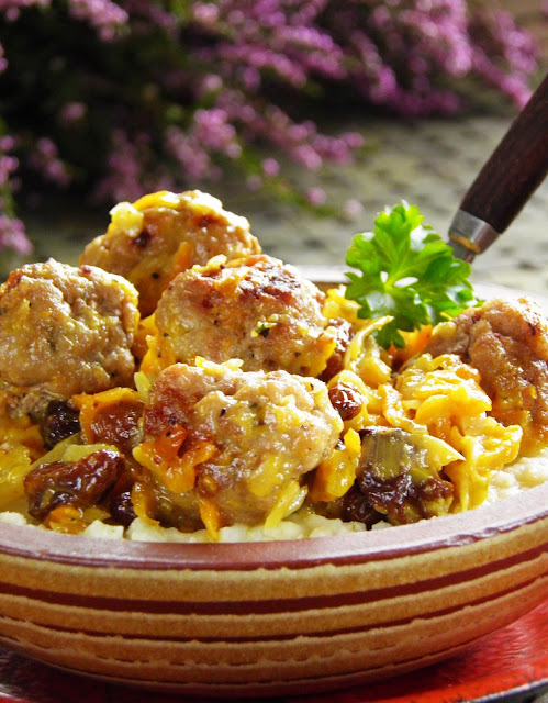 To danie (prawie w tej postaci) zrobiłam na spotkaniu kulinarnym, o którym za kilka dni opowiem. Danie bardzo klimatyczne i jesienne. Znajdziecie w nim nasze wspaniałe warzywa bulwiaste, jak seler i marchew, poza tym ma w sobie sporo cebuli, słodkich rodzynek i korzenne nuty cynamonu i gałki muszkatołowej. Dla mnie pycha.