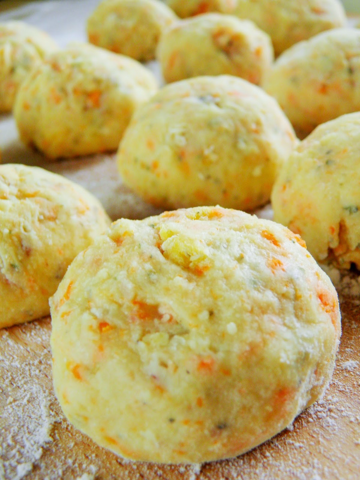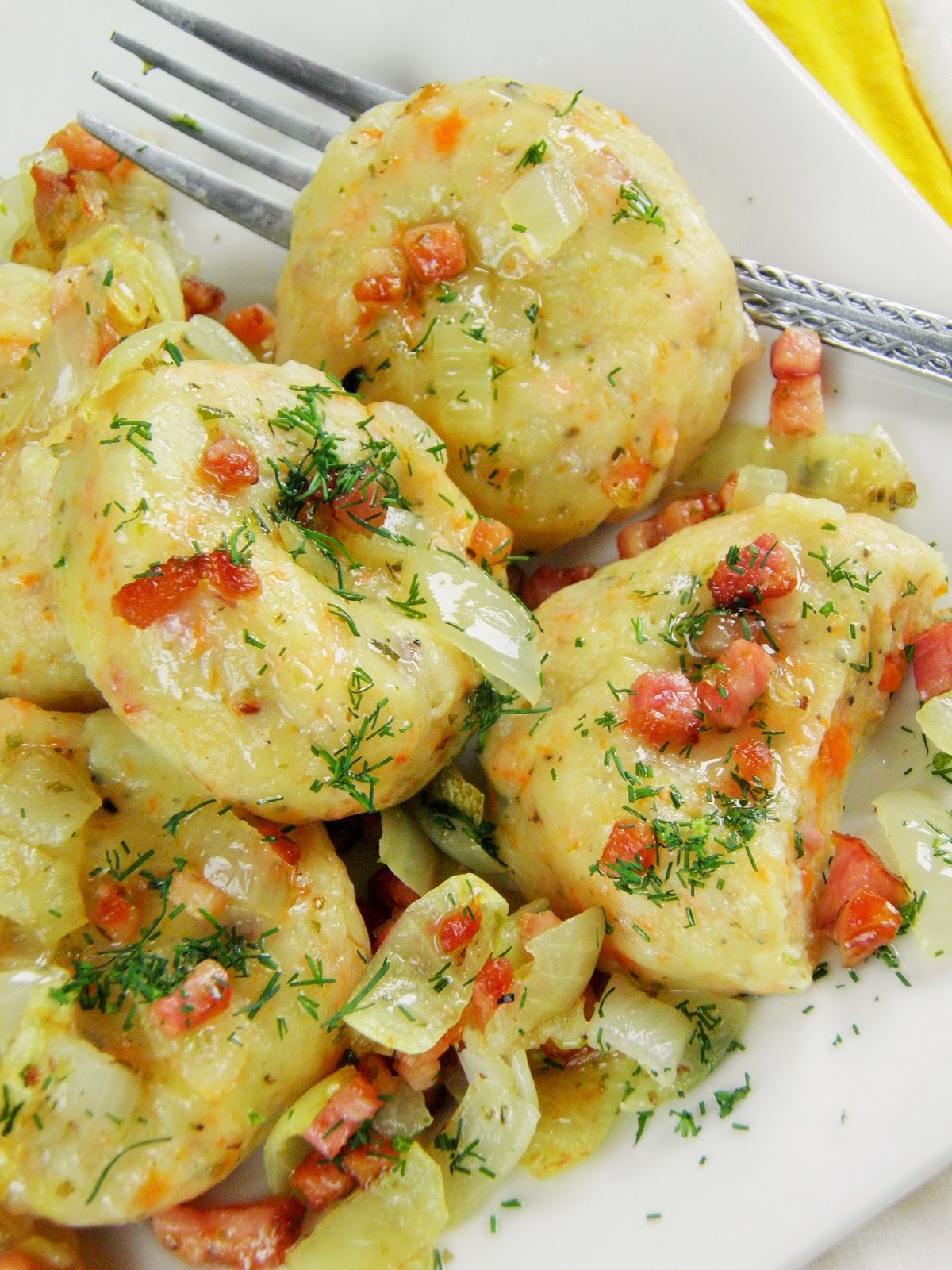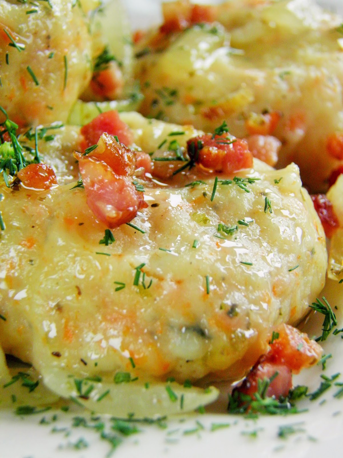 Ziemniaczane kluski nie muszą być nudne; można wzbogacać i dodawać im nowego smaku - tak więc dziś dodałam do nich marchew i chrupiący boczek, przez co smakują naprawdę świetnie :)