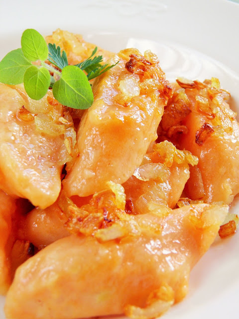 Dziś na obiad to co bardzo lubię od najmłodszych lat, czyli kopytka, tylko że w pięknym jesiennym kolorze - dodałam do ciasta koncentrat pomidorowy. Smaku dodał im również czosnek.