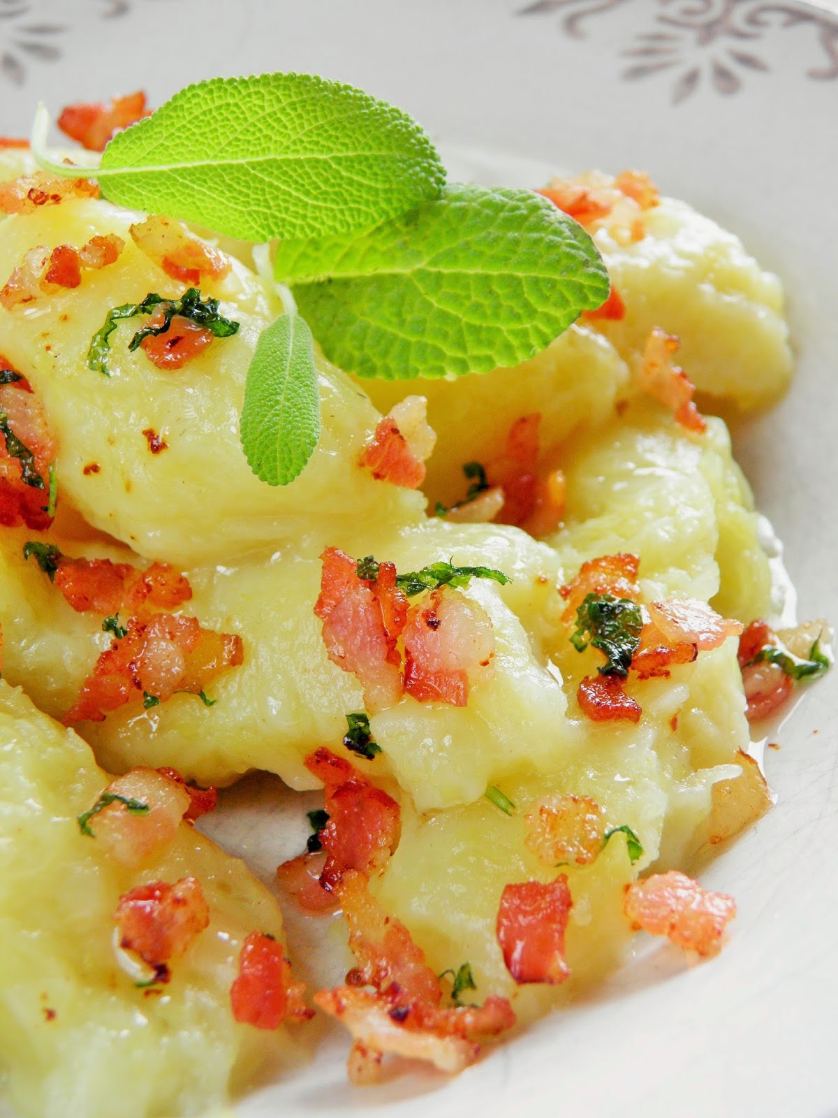 Wczoraj sprawdziłam, czy z tartych ziemniaków da się zrobić naleśniki, a dziś będziemy jedli na obiad kopytka. Tyle że ciasto zrobiłam pół na pół z ziemniaków gotowanych i surowych. Powiem Wam, że fajne danie :) Okrasiłam te moje kopytka boczkie...