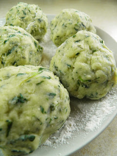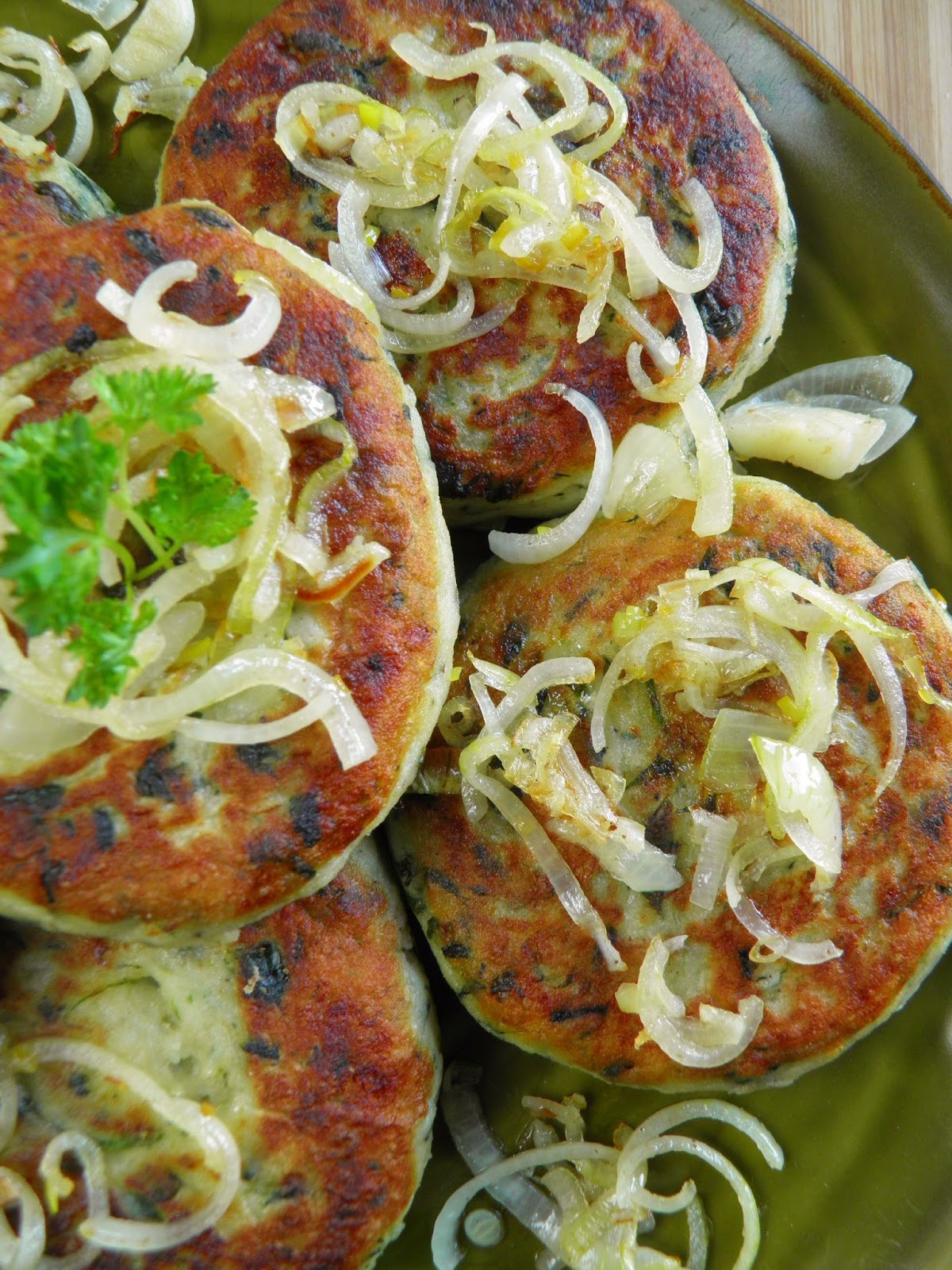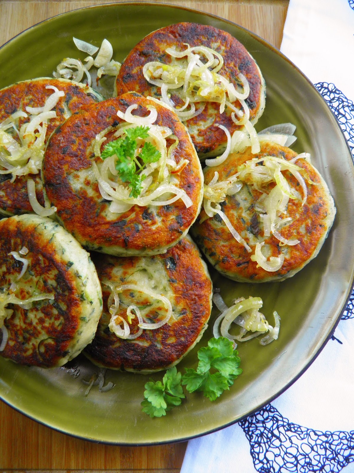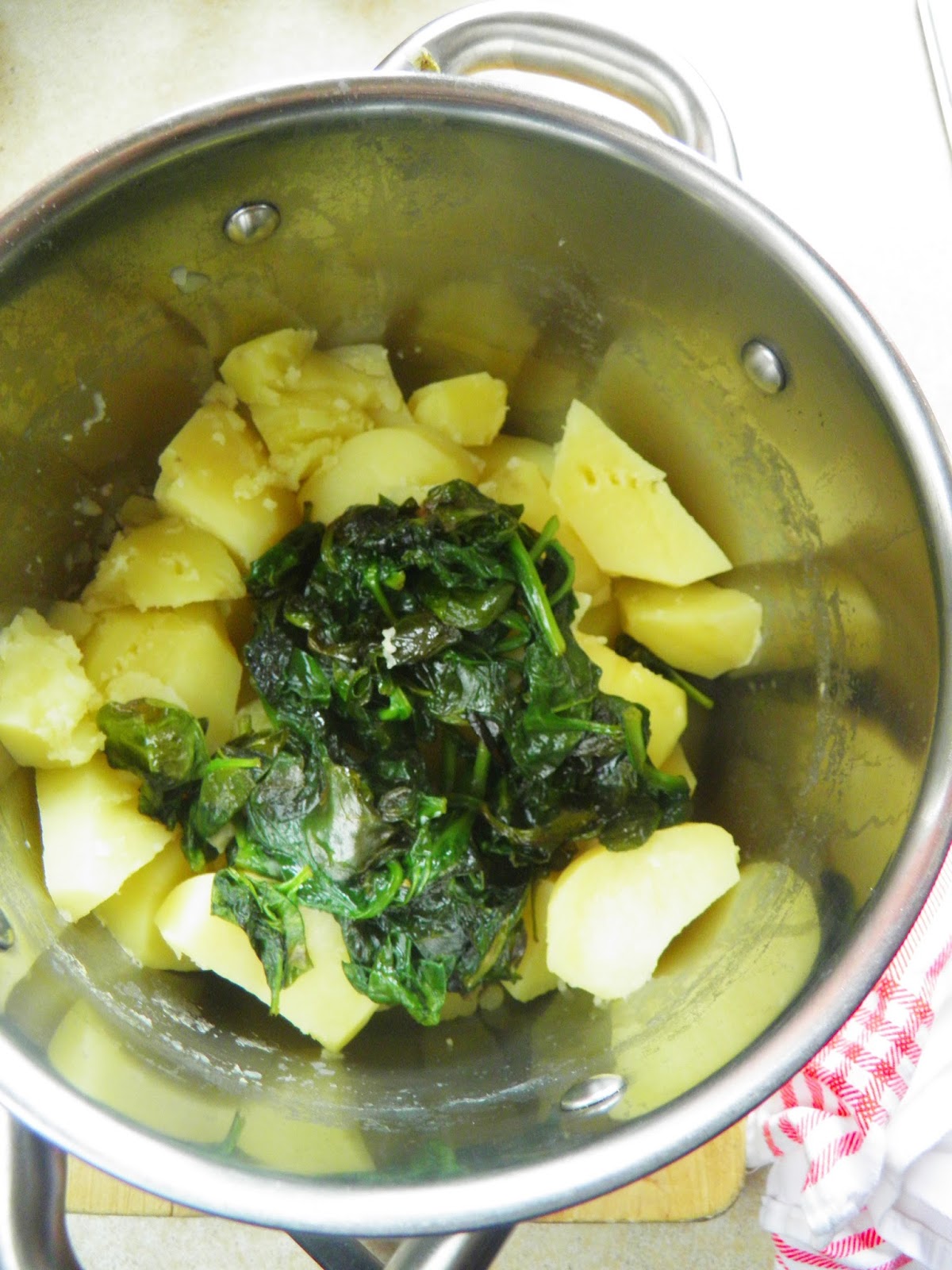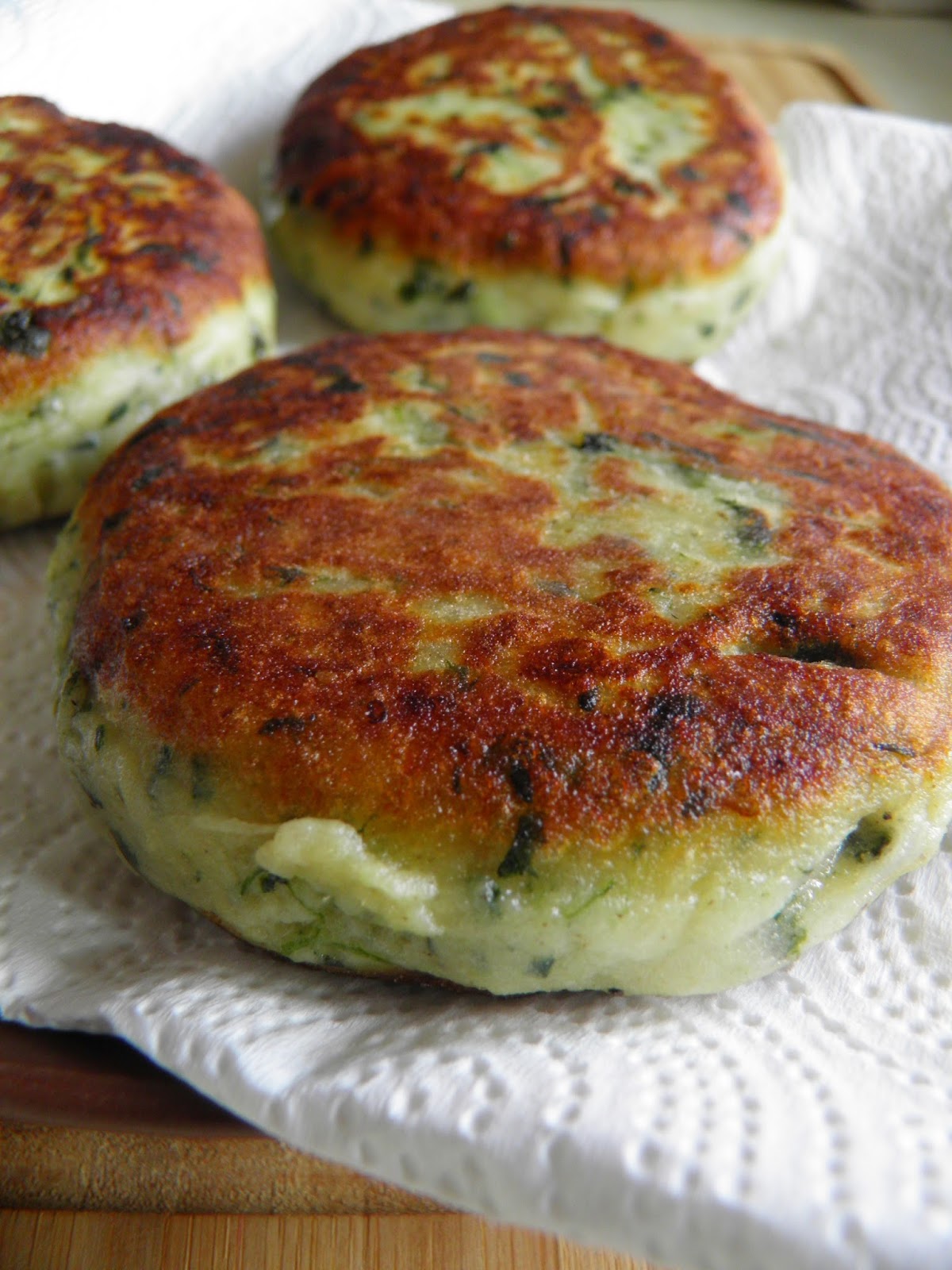 Składniki na 6-8 sztuk:1 kg ziemniaków 2 garście świeżych liści szpinaku1 ząbek czosnku1 jajko3-4 łyżki mąki pszennejsól, pieprz do smaku1 łyżeczka olejuDodatkowo:olej dosmażenia1 -2 cebulePrzygotowanie:Obrane ziemniaki gotuję do miękkości, odcedzam i studzę. Szpinak smażę przez minutę na łyżeczce oleju, przekładam do ziemniaków i wszystko przepuszczam przez praskę lub maszynkę (można dokładnie podusić widelcem). Dodaję przeciśnięty przez praskę czosnek, doprawiam masę do smaku solą i pieprzem. Dodaję jajko i 3 łyżki mąki, mieszam łyżką by wszystko się połączyło. Jeśli ciasto bardzo się klei, dosypuję jeszcze trochę mąki. ważne jest, by nie mieszać masy za długo, bo będzie robiła się coraz rzadsza. Dzielę ciasto na 6-8 części, z każdej formuję kulkę, lekko ją spłaszczam. Tak przygotowane kotlety smażę na średnim ogniu, przewracając je delikatnie drewnianą łopatką 2 razy. Usmażone powinny ładnie się zarumienić. Przekładam je na chwilę na papier do odsączenia nadmiaru tłuszczu. Podaję z podrumienioną cebulką.